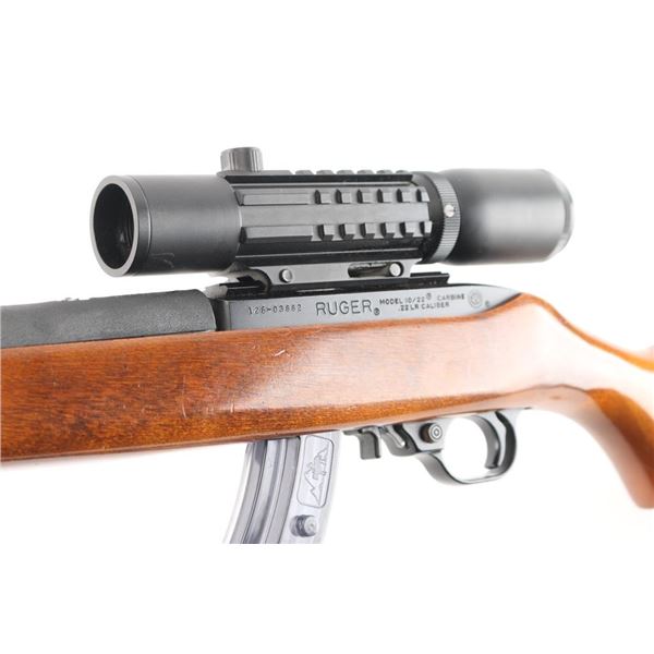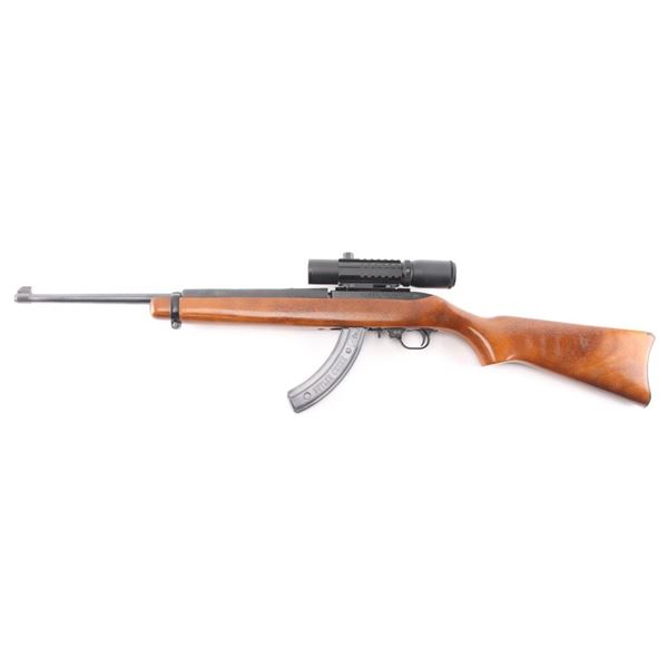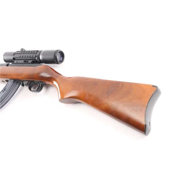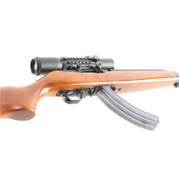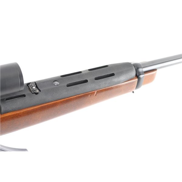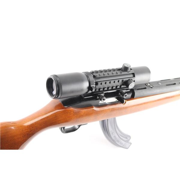 American made semi-automatic carbine. Blued finish, black alloy receiver, approximately 18 5/8" barrel, , blade/brass bead front sight, flip-up open notch rear sight, drilled/tapped receiver, push button safety, smooth trigger, upgraded with vented tactical heat shield, smooth walnut stock with a pistol grip, minor scratches, very small chip under right receiver. Blue/matte black is about 98% with minor scratches. Bore is Excellent/Bright. Butler Creek 30 rd magazine. Mounted with a FM optics tactical scope wit accessory rails, Mil-Dot reticle, clear optics. Power not marked.NRA Condition-Very Good+. Modern Firearm.