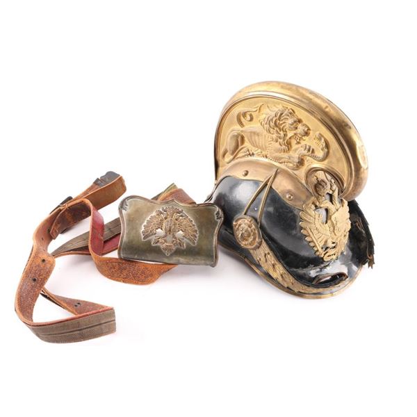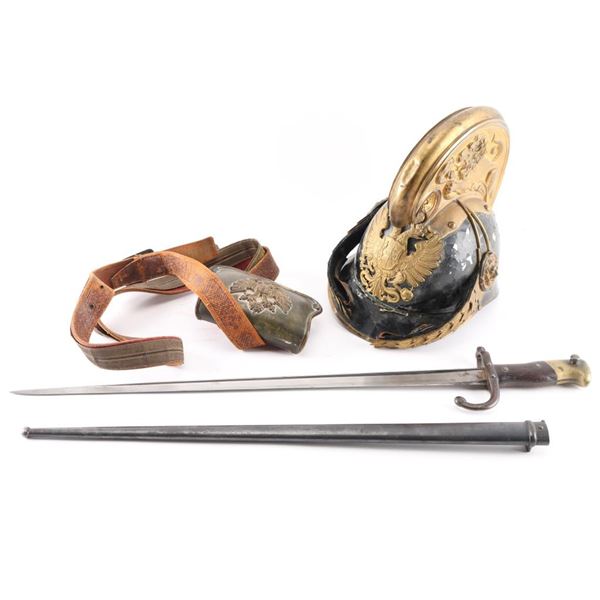 French Lebel bayonet, Austrian officers dragoon helmet & artillery cartridge box.