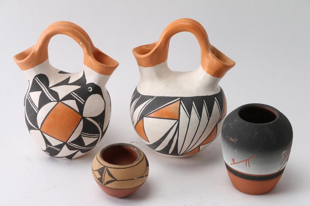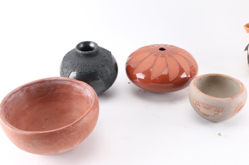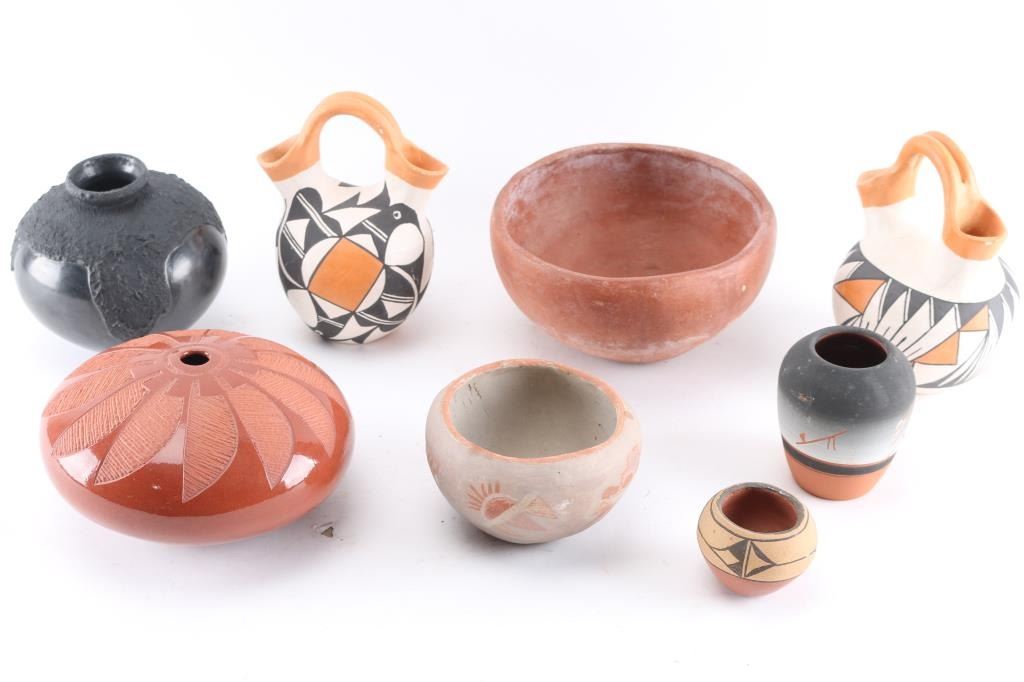 2 Acoma wedding vases, 1 blackware, 1 redware, 1 terracotta bowl signed, 2 small bowls and 1 small pot.