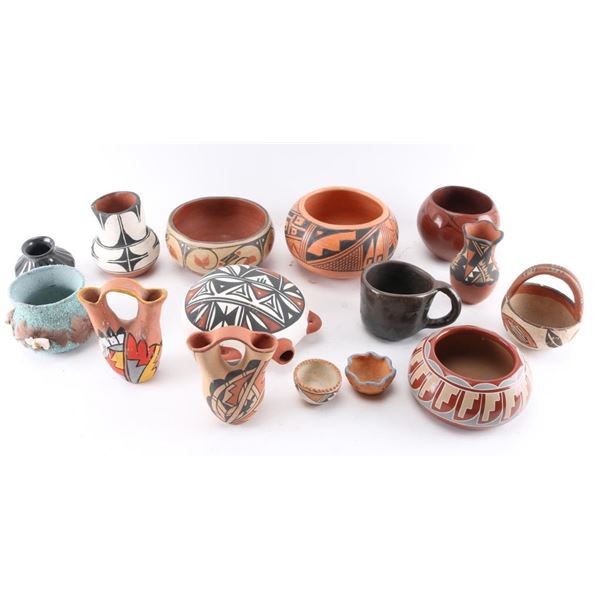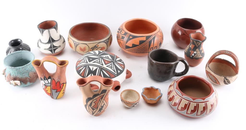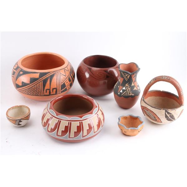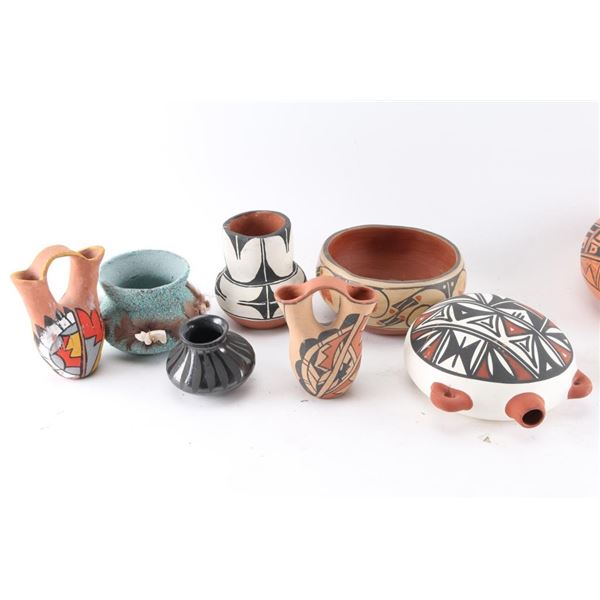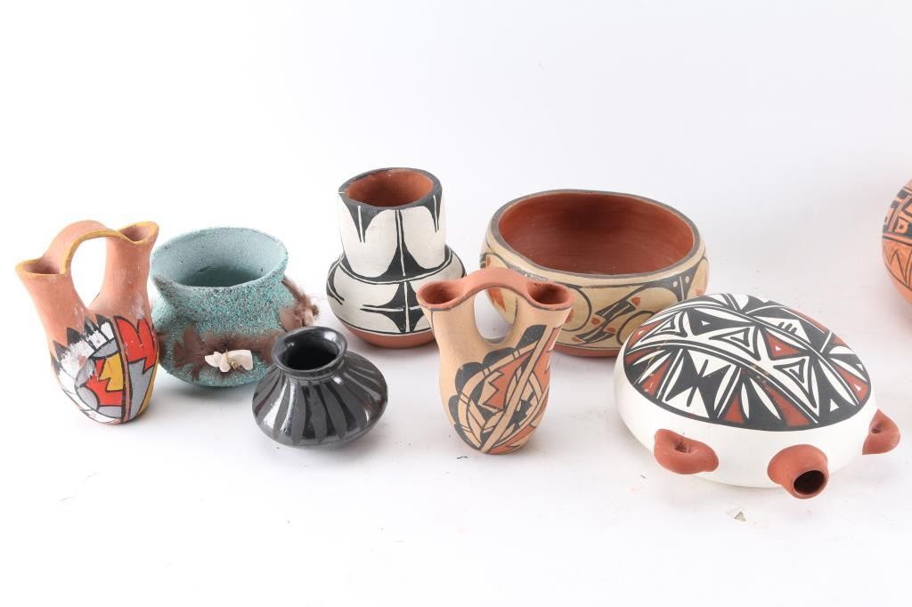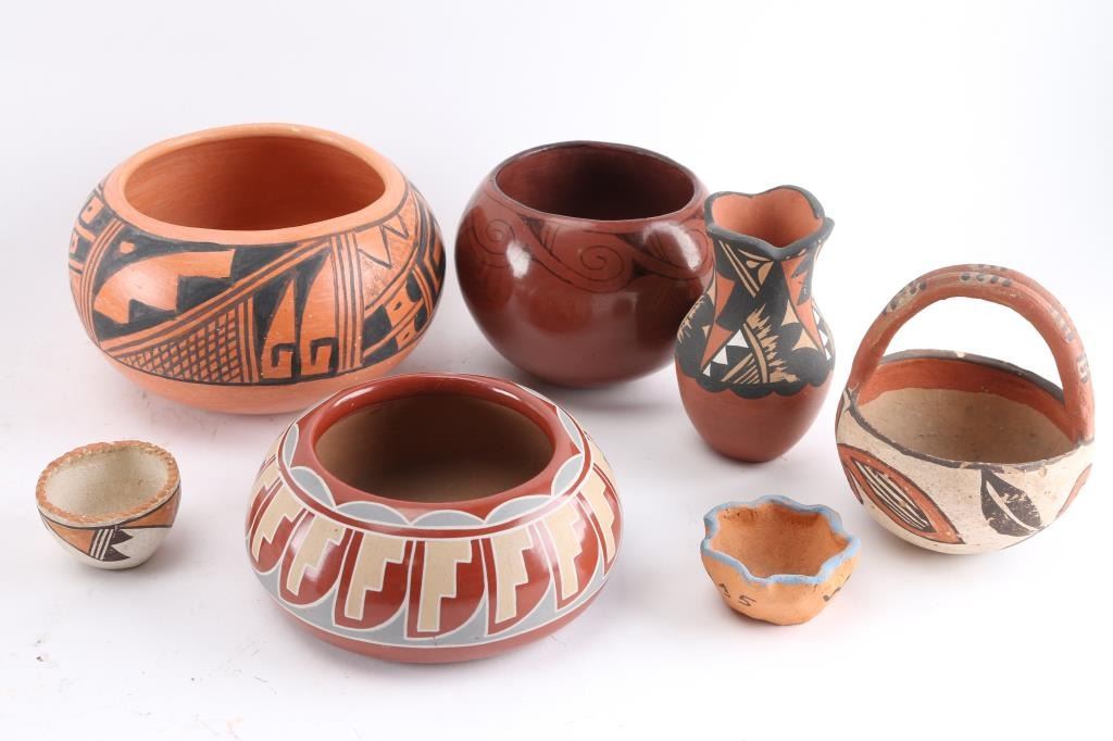 2 wedding vases (1 Jemez), 2 redware pot signed, 1 pot 7" x 4", 1 small Acoma bowl, and others