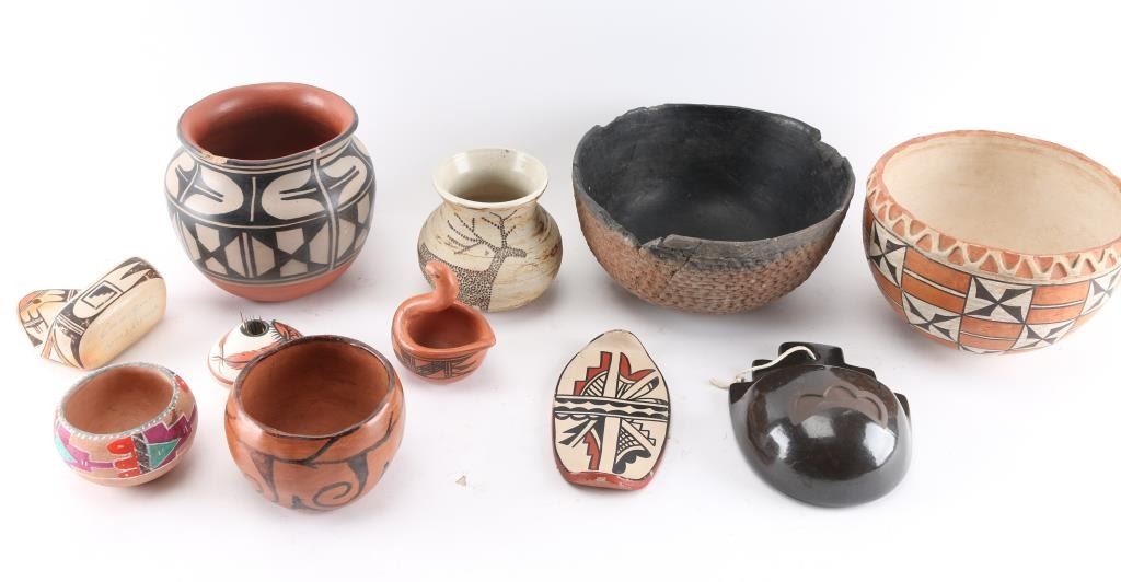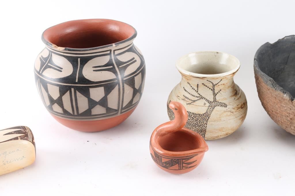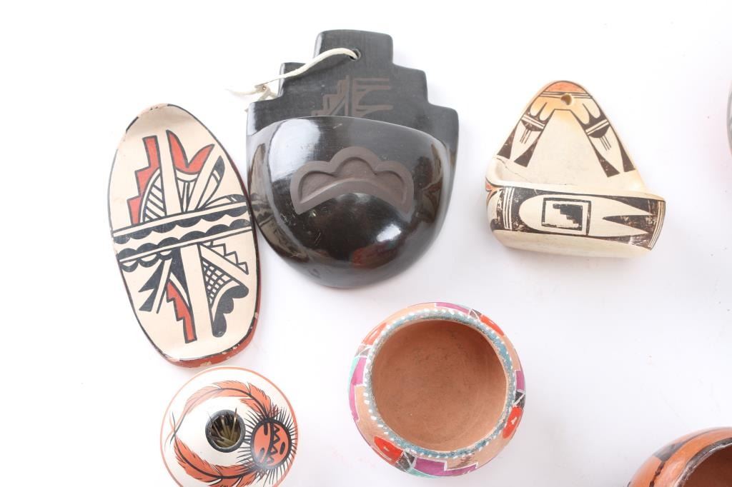 1 medium pot signed Pacheco, 1 small pot signed Tangreen #53, 1 medium pot 8" x 5", 1 medium pot (chipped rim) 8-1/2" x 4-1/2", 2 wall hangings, and others.