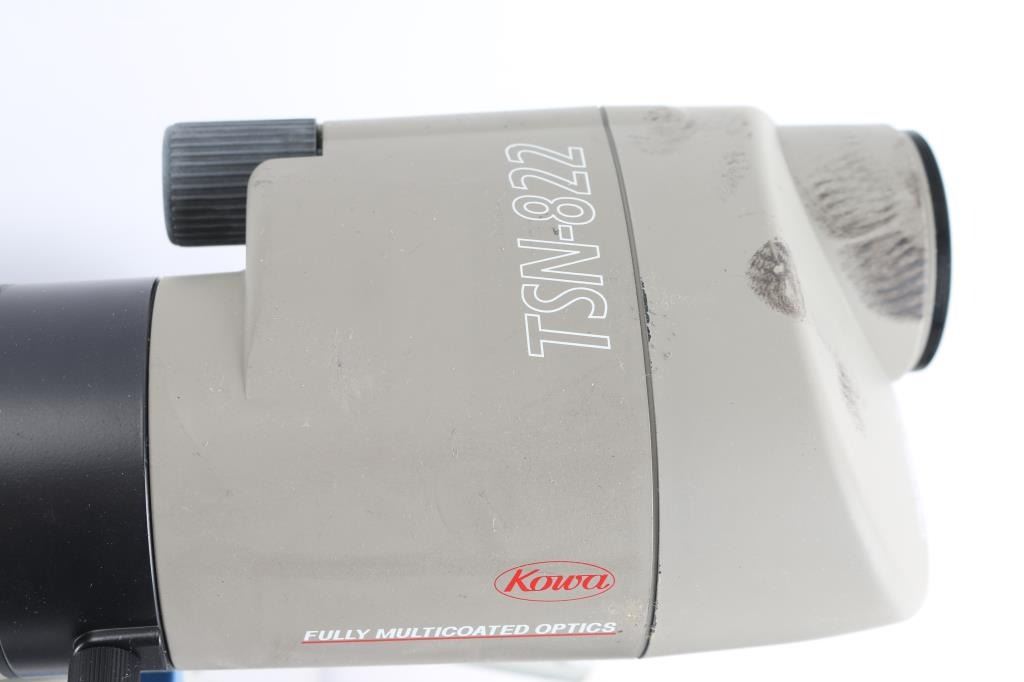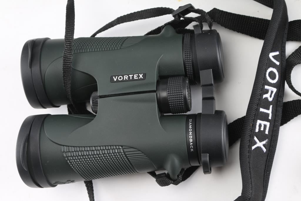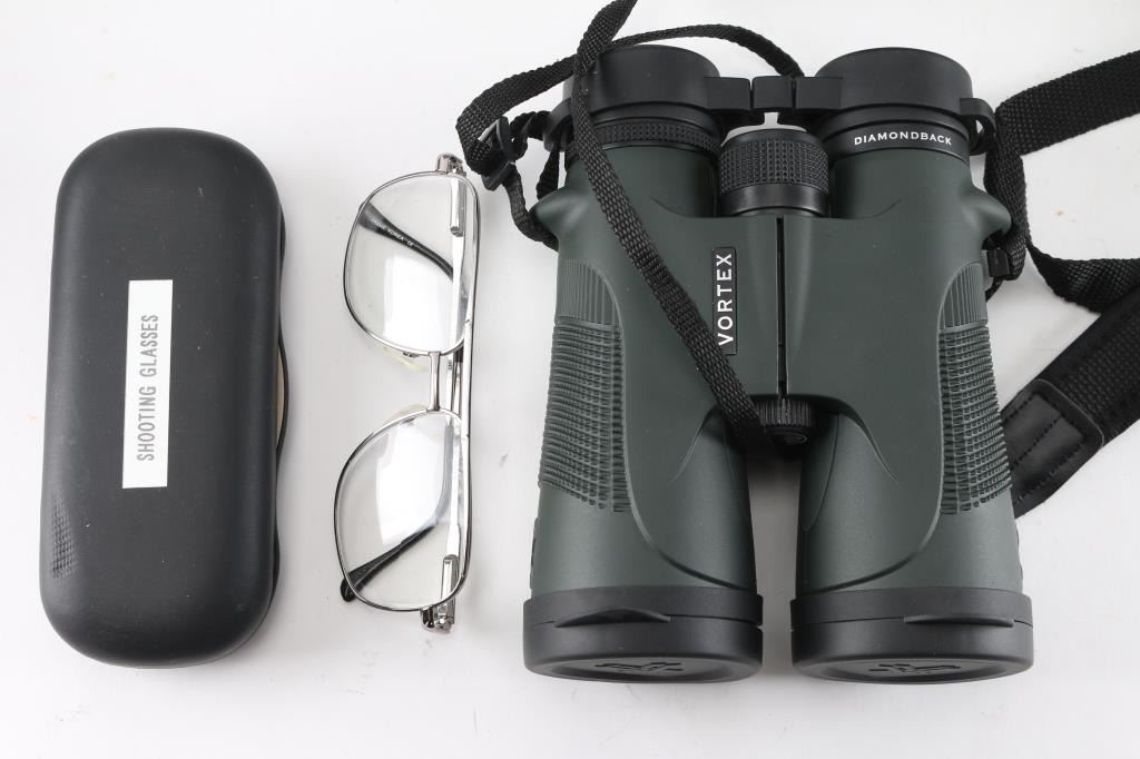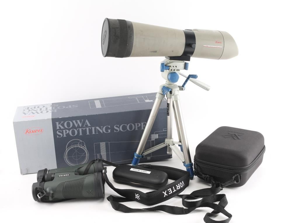 Includes a set of Vortex Diamondback 12 X 50 Binoculars, unused w/ black protective case; a Kowa TSN-822 Spotting Scope w/TSN-Z7/820 eye piece 20 X 60 zoom, factory box and green nylon carrying case; a small aluminum Vivitar tripod and a pair of shooting glasses in unknown prescription.