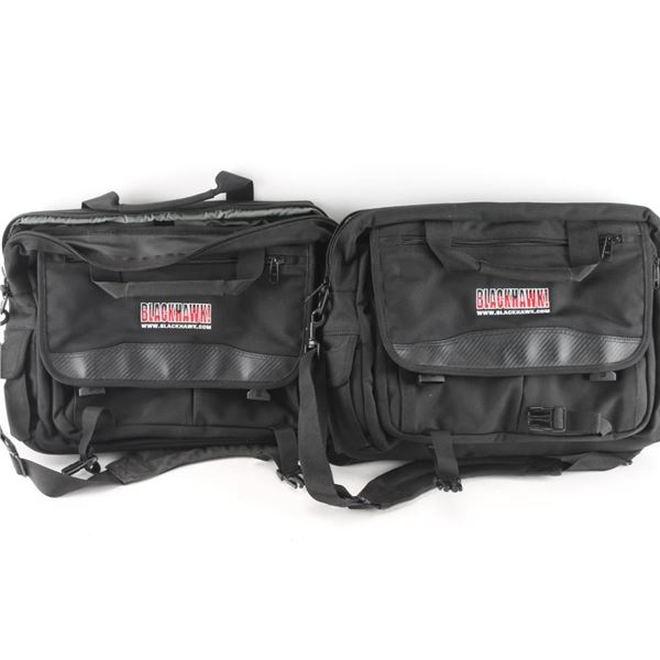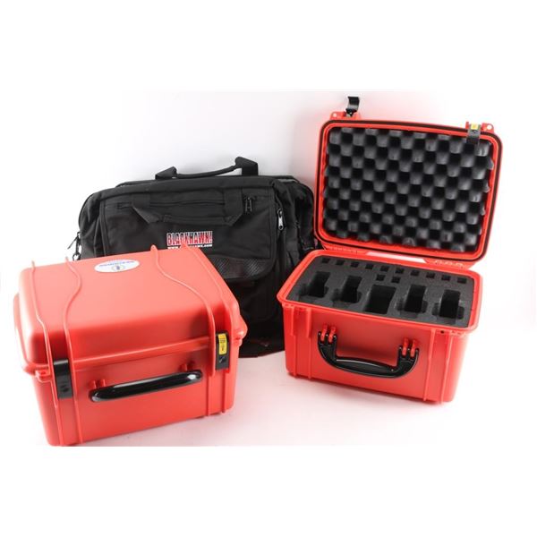 Four total. 2 - Orange colored Seahorse SE540 hard shell protective cases. One case fits 4 pistols, 12 pistol magazines and small center pocket for eye & ear pro, weapon lights, etc...Seahorse cases have been waterproof tested & proven to withstand all IP67 standards. Built for continuous submersion of up to 3 meters deep. Also included are 2 - Black colored Blackhawk laptop computer/ brief cases made of cordura/nylon/neoprene w/multiple pockets inside and out, for laptop computer, pistol, etc...All unused and in excellent condition.