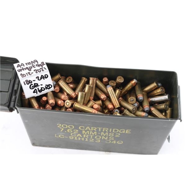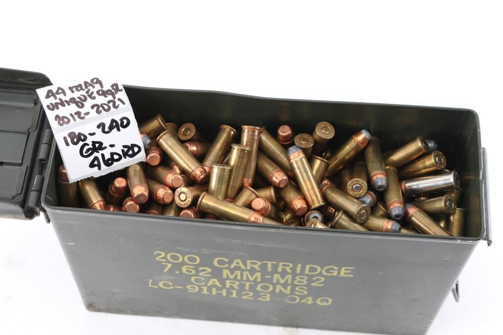 Approx. 460 rounds of reloaded 44 Magnum ammunition. All have 9 Grains of Alliant Unique powder with a 180 or 240 Gr. bullet. All loose in metal ammo can.