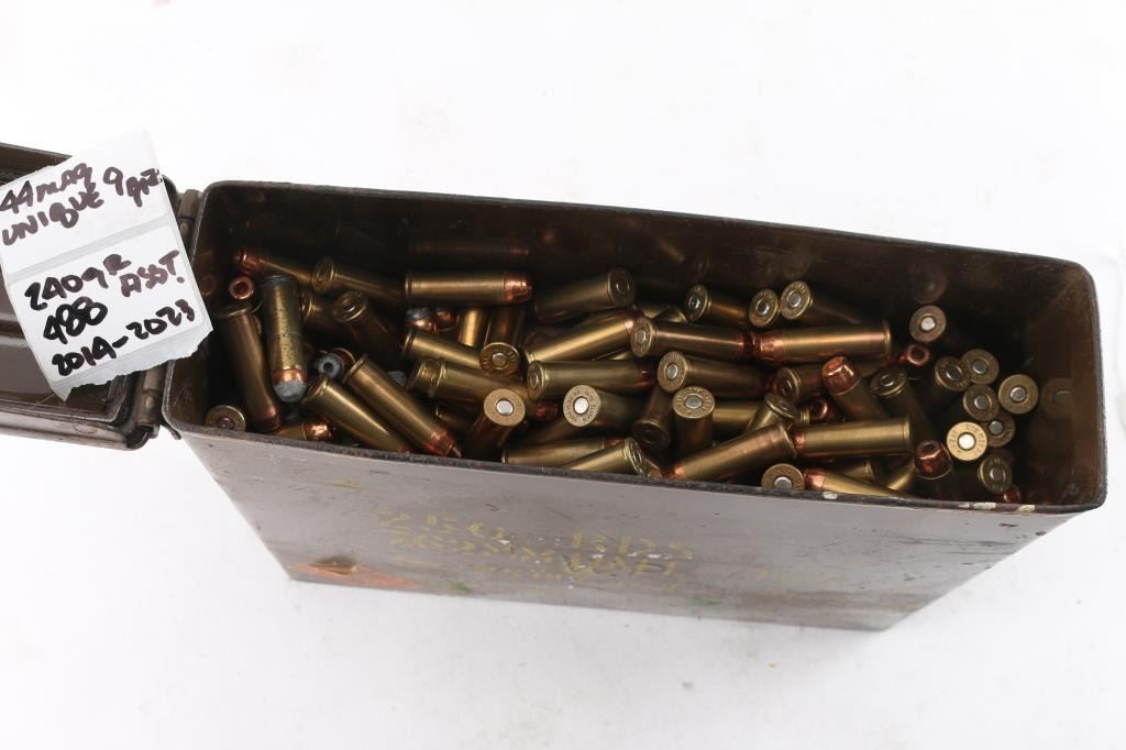 Approx. 450 rounds of reloaded 44 Magnum ammunition. All are loaded w/9 Grains of Alliant Unique powder & a 240 Gr. Projectile. All loose in metal ammo can.