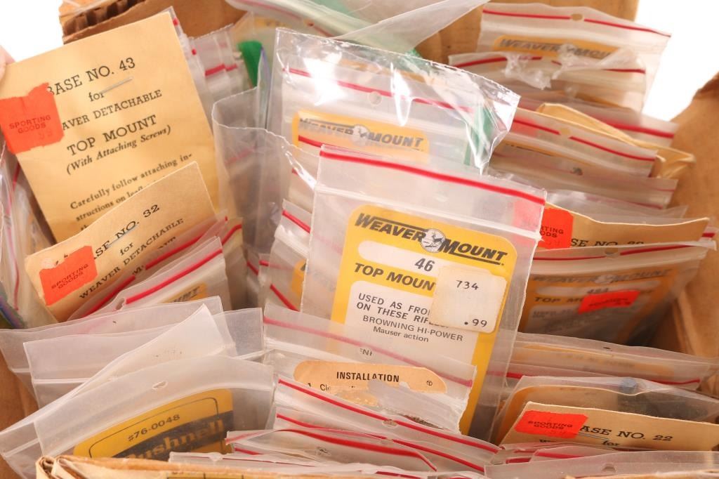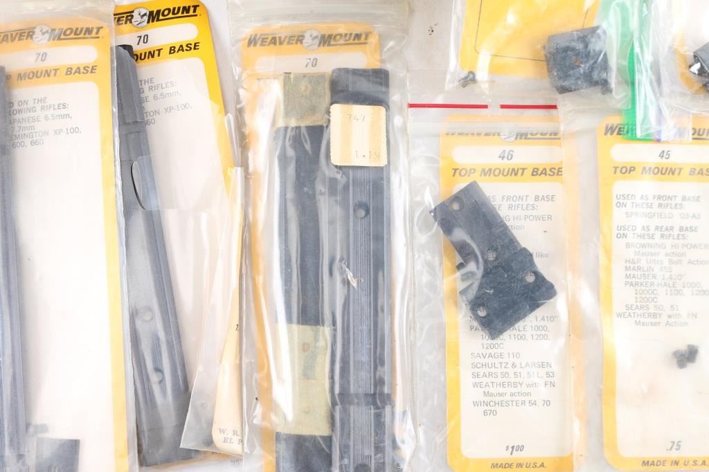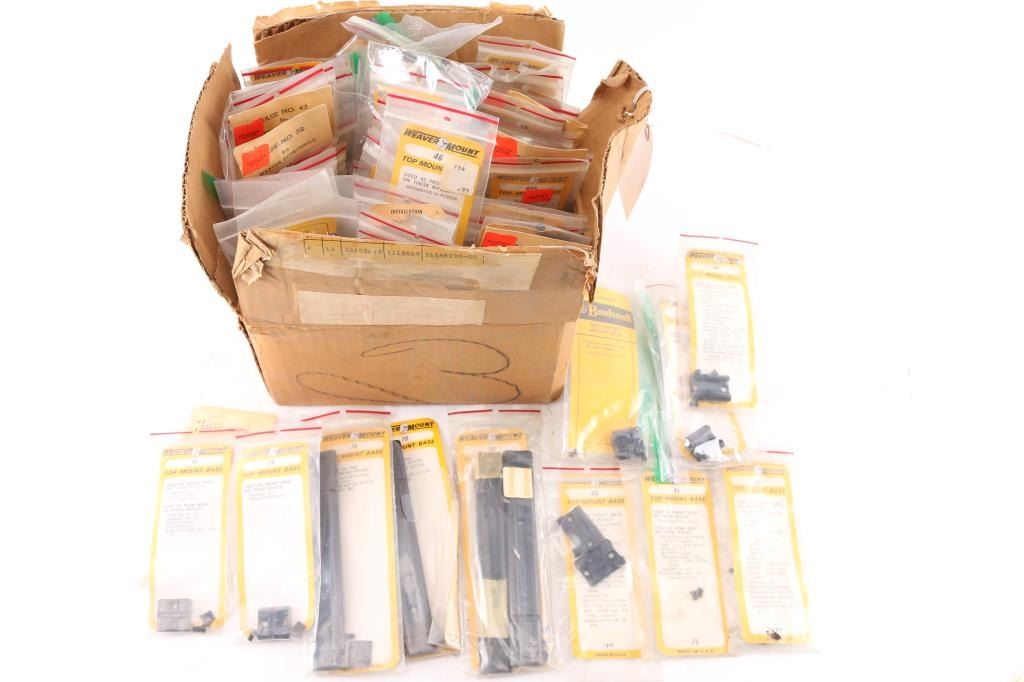 Weaver and some Bushnell. Includes over 100 factory new Weaver top mount bases for various firearms. Weaver model numbers range from 11 to 75 and Bushnell model numbers 76-0048, XX54, XX55 & XX59. All in factory packaging.