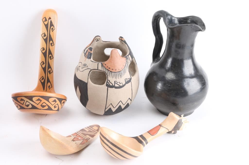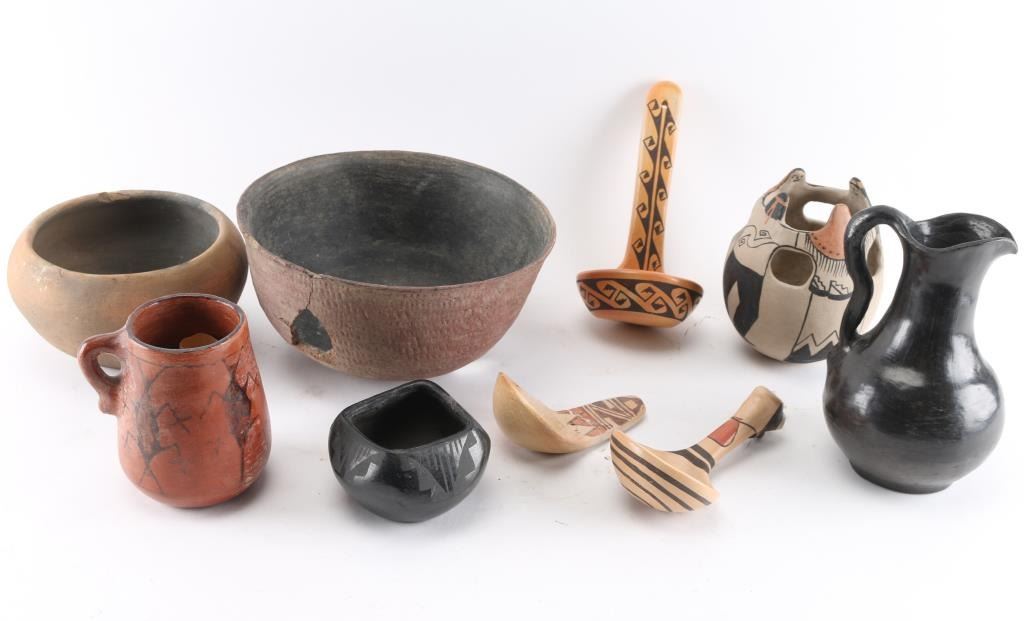 1 Maricopa pot, 3 ladles, corrugated redware pot w/ kill hole, 1 blackware pitcher, and others.