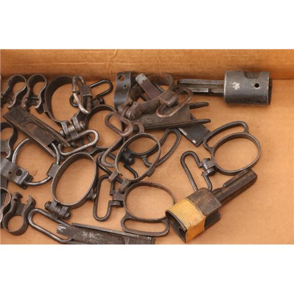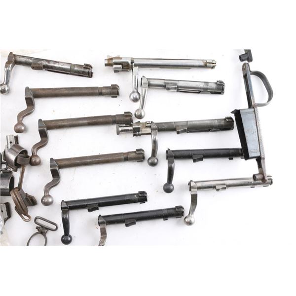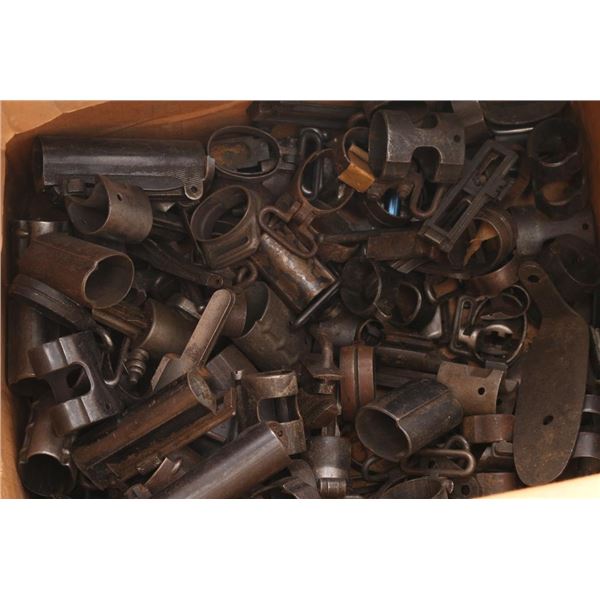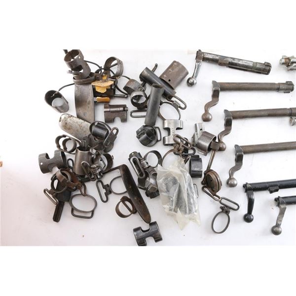 Includes multiple complete bolts for Mauser and others. Multiple trigger guards, metal bands w/sling swivels, butt plates and much more. Most parts are in good condition.