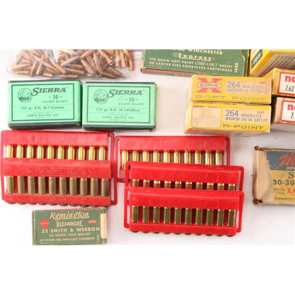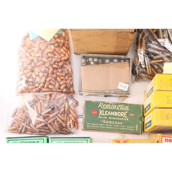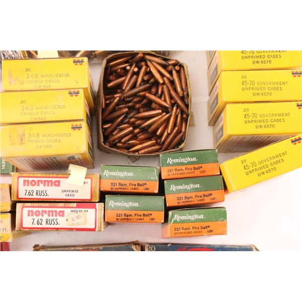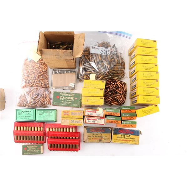 Includes: Various brass for 30-30, .221 REM, 7.62 RUSS, .264 Magnum, .348 WIN, ,32 S&W, .310, 30-06, .300 H&H MAG, (4.85lbs) 7.62x39. (200) Sierra 30 caliber 110gr bullets, (Apprx. 500) 9mm bullets, (Apprx. 140) 7.62mm bullets.****Counts are approximate (+/-)****
