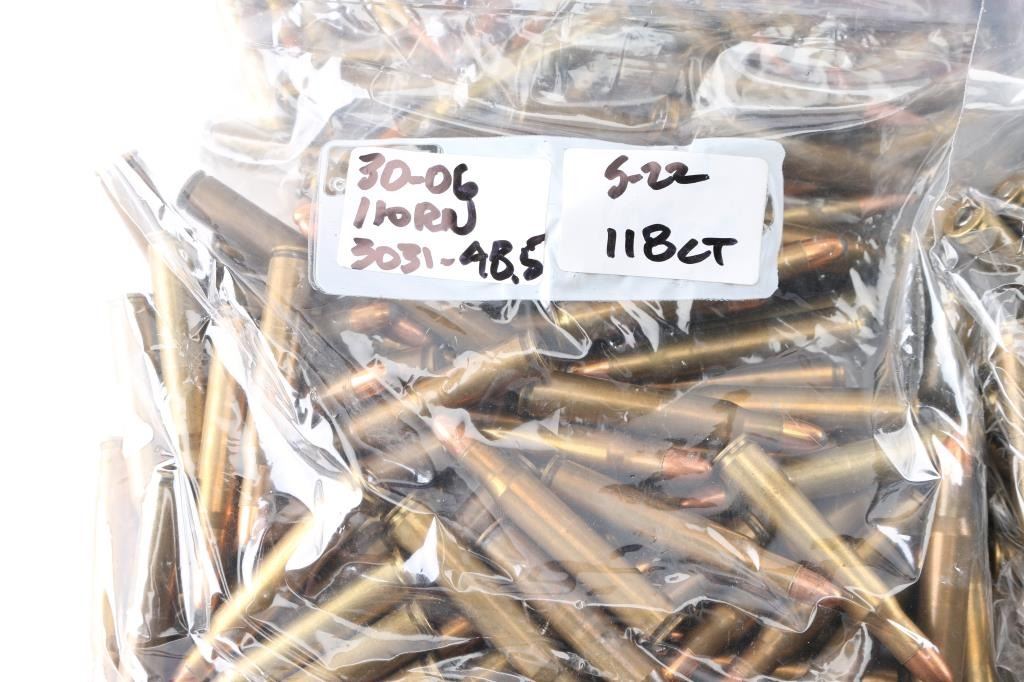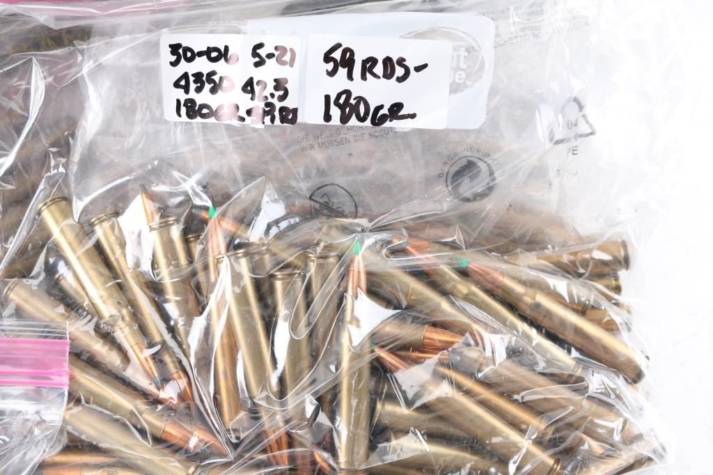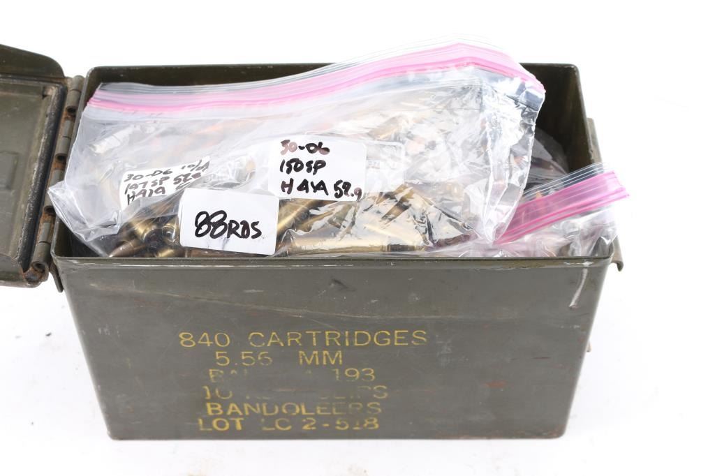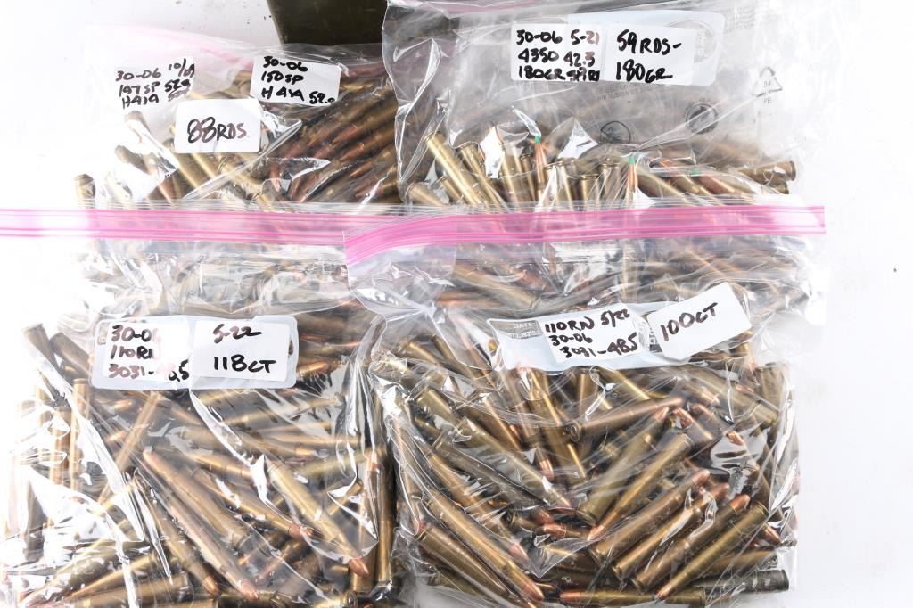 Approx. 529 rounds of reloaded 30-06 ammunition. Various loads & bullets. In ziplock bags, loose in metal ammo can.