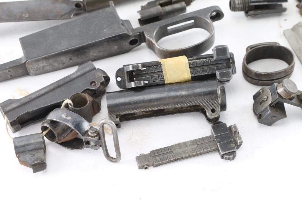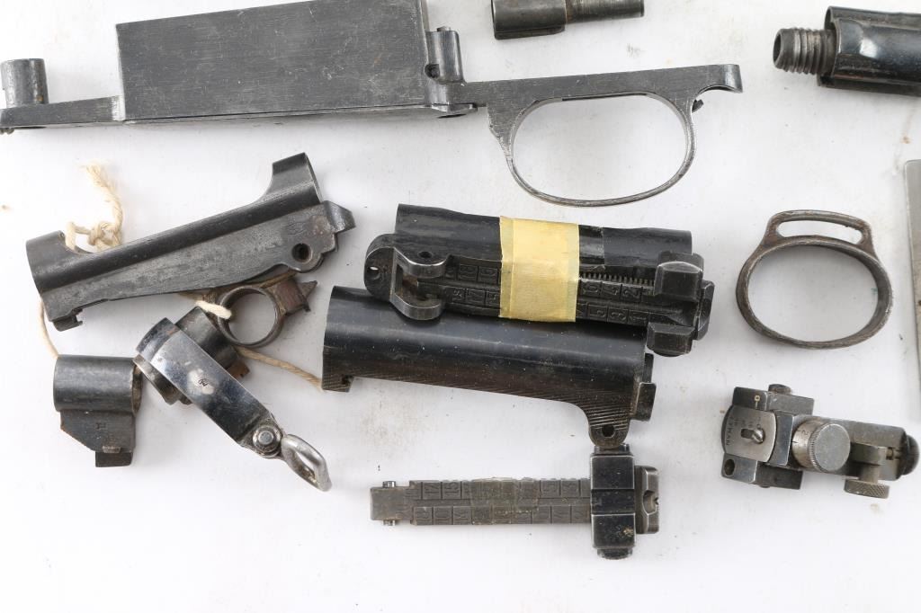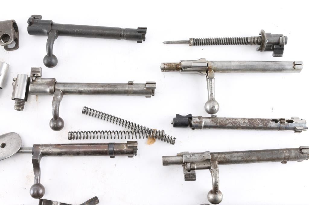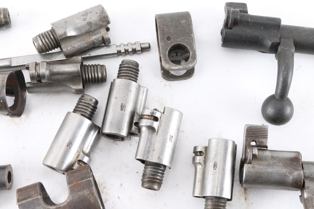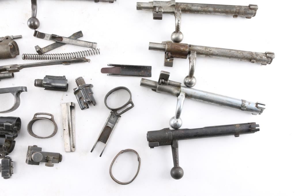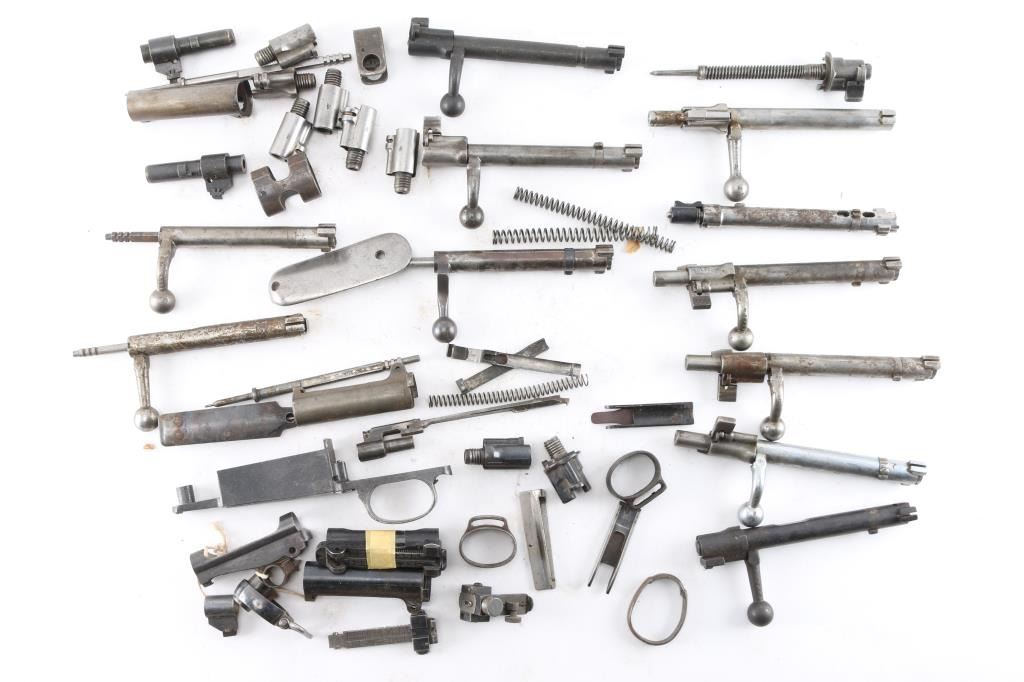 Includes Mauser bolts and others, bands, rear sights, butt plates, springs and more. Most are fair to good condition.