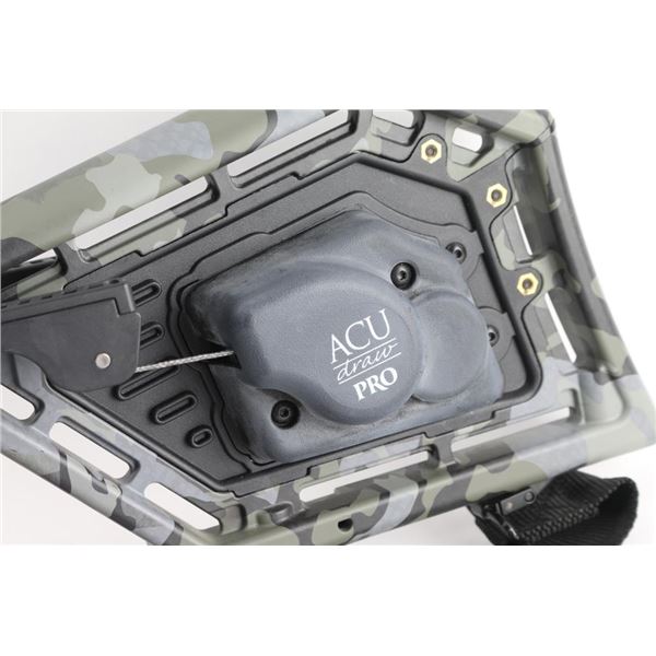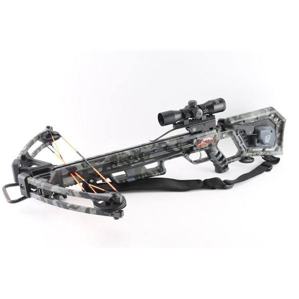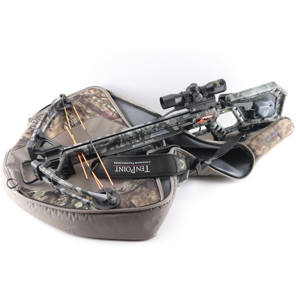 by Ten Point with scope, case and arrows . Camo frame in like new condition.