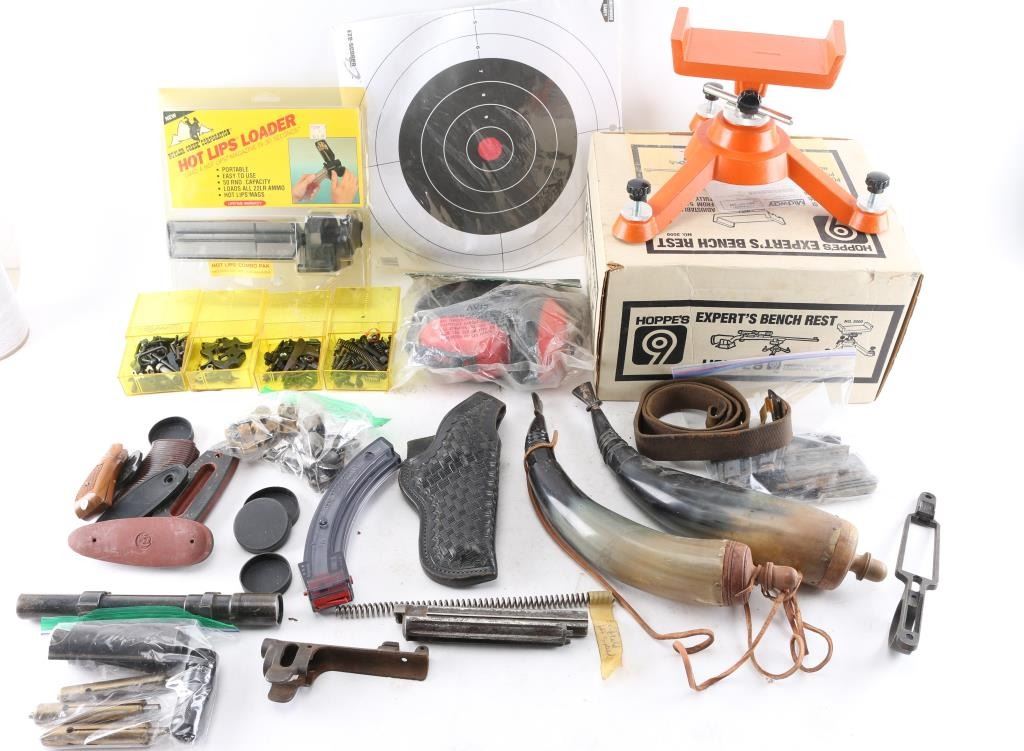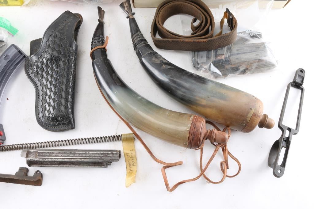 Includes large items such as a rare German WWII G41/K43 milled bolt housing w/small fracture on top, rust inside and heavily pitted; Lee Enfield No.1 Mk III nose cap; a pair of S&W J-Frame wood grips & a pair of German WWII P38 brown plastic grips; M1917 Enfield trigger guard; Thompson Center Contender front and rear sights; M7 telescope, mainly used for artillery, marked "TELESCOPE, M-7, SERIAL NO. 28436/ STOCK NO. 7671693; many small parts such as triggers, hammers, pins and springs and much more.