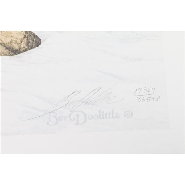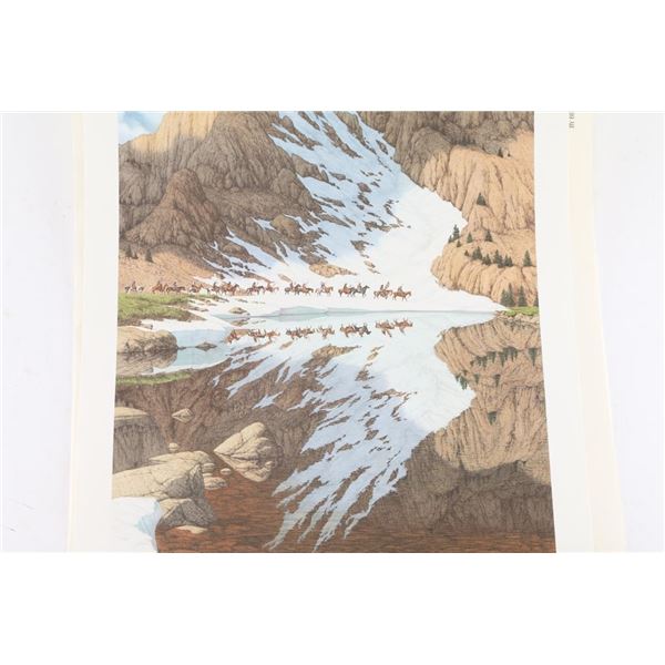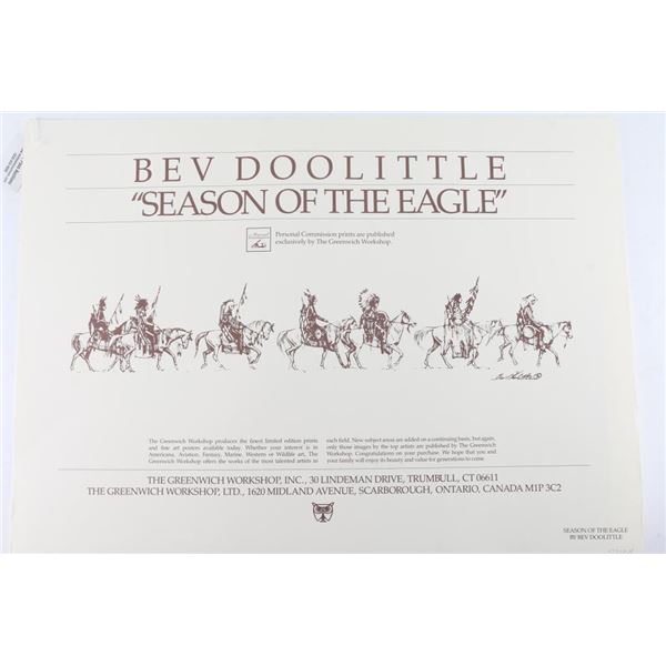 Entitled "Season of the Eagle", signed and numbered 17309 through 17320, and 17324 through 17328, of 36,548. Bev Doolittles talent in the medium of transparent watercolor has won a growing following across the West. A member of the National Watercolor Society, she has been active in its exhibitions. Her paintings are included in the Favell Museum of Western Art and Indian Artifacts in Klamath Falls, Oregon, and the IBM Corporate Art Collection in Tucson, Arizona, as well as numerous private collections. Prints measure 31" x 22".