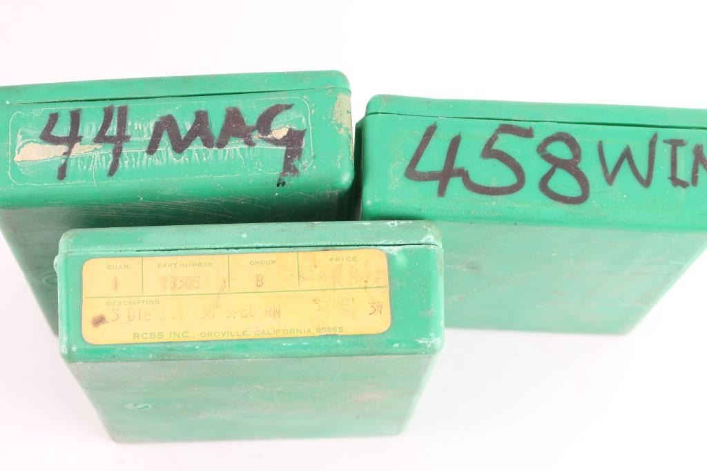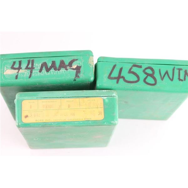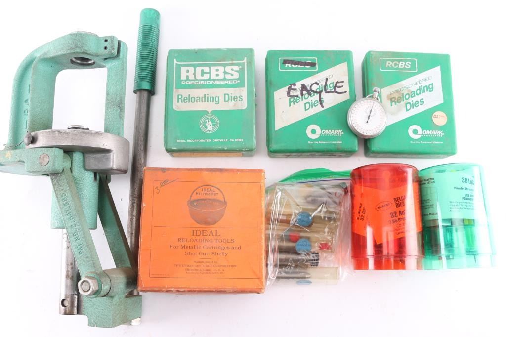Includes: 1 - RCBS Rock Chucker Press, 2 - RCBS Dies for .458 Win. & 38 Special, 2 - Lee dies for 30 Luger & 32 ACP, 1 - Eagle dies for 44 Magnum, 1 - Ideal melting pot, 1 - Wilson Cartridge case gage, 10 - Bore sight arbor shells from 22-250 to 308.