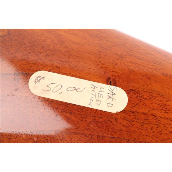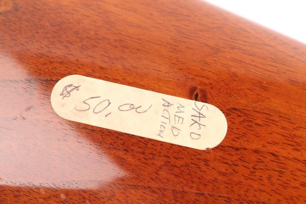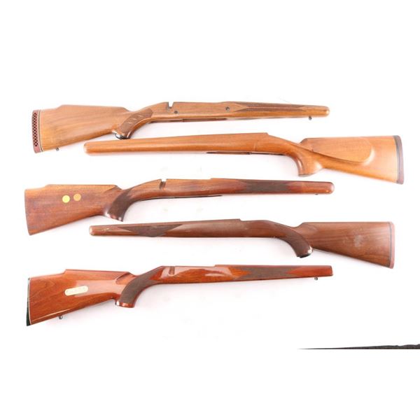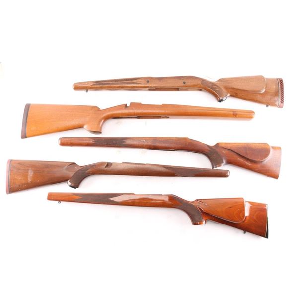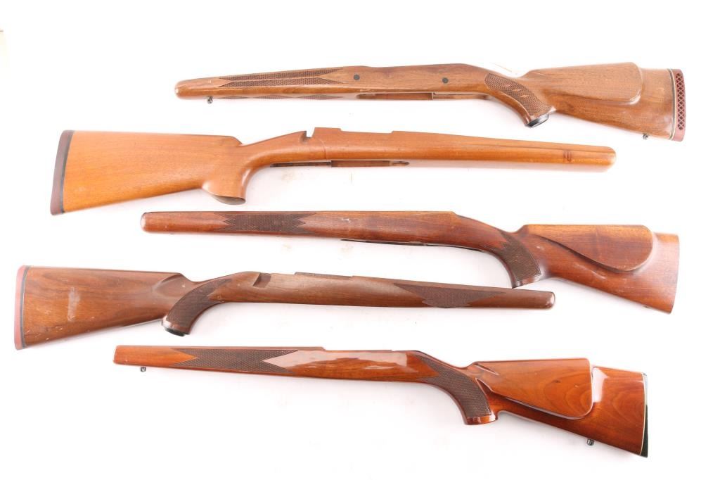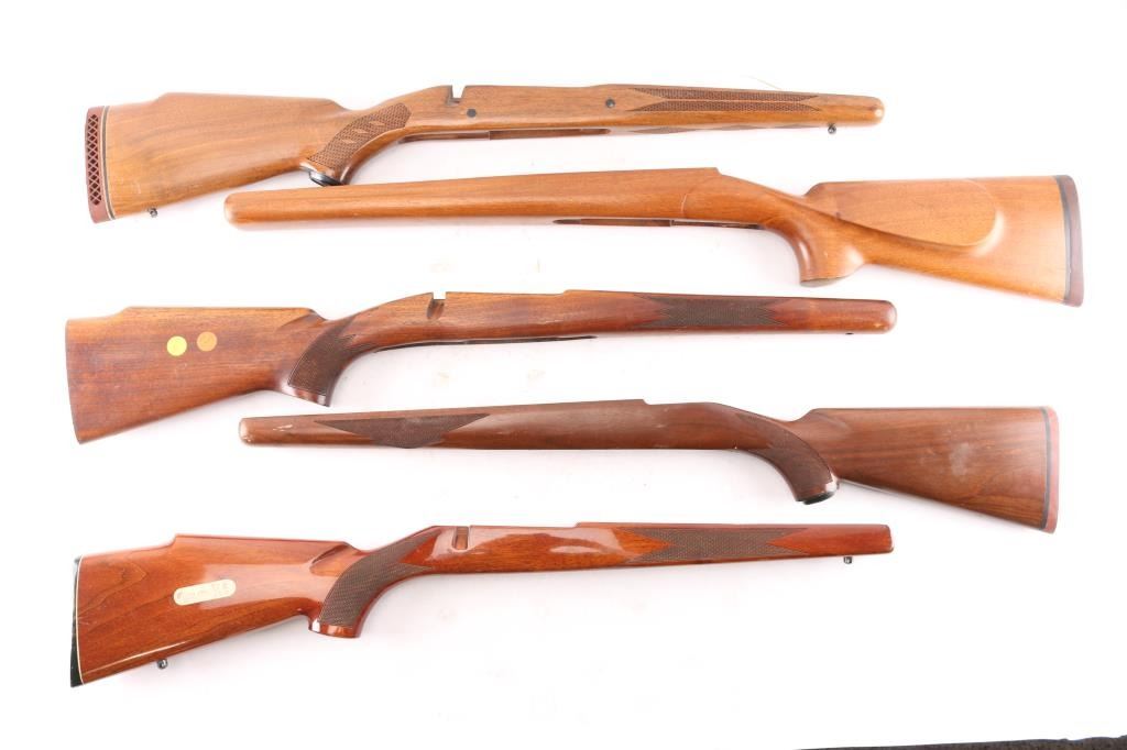 3 - Winchester, one w/checkered forearm and grips, metal grip cap, red rubber vented butt pad, swivel sling studs and semi-gloss finish. Some marring, dents and scratches on butt stock; 1 - Sako w/sling swivel studs, serrated plastic butt plate and high gloss finish, a couple of small dents on left side of butt stock; 1 - Ruger w/checkered grips and forearm, metal grip cap w/Ruger logo and red rubber Ruger butt pad. Scratches and dents on right side. Good to very good condition.