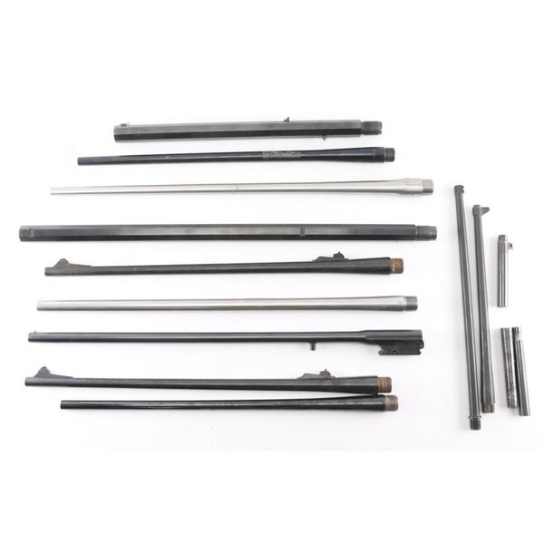 (1)28" Numrich Arms .444 M Buffalo Hexagonal, excellent bore and strong rifling slightly dirty, Retains 98% blue finish, no sights, excellent condition, (1)16 3/8" Navy Arms Co. 45-70 Hexagonal, bright bore and strong rifling, retains approx. 85% blue finish w/some nicks and scratches, attached sights, very good condition, (2)24" Remington 7mm Rem Mag w/front and rear sights, some rust and pitting on both, rust in bore, other very good, (1)22" Remington 30-06, no sights, retains 80% blue finish with some rust at front end and edge wear, very good bore and strong rifling, (1)22" Winchester Model 670, 308 Win., sights removed, retains approx. 90% blue finish w/slight edge wear on front end, bright bore and strong rifling, very good condition, (2)26" Stainless steel unmarked, .308 & 25 1/4" stainless unmarked 22-250, no sights, excellent bores and strong rifling, one slightly dirty, (1)26" H&R Topper 20Ga. 3"chamber MOD choke, retains approx. 90% blue finish, bright bore, excellent condition, (1)14" H&R M4 survival rifle, 22 Hornet, stamped "40640" on top, some rust at front sight, bright bore and strong rifling slightly dirty, good condition, (1)16 1/2" Luger barrel 9mm, no front sight blade, retains approx. 90% blue finish w/small scratches and slight edge wear, bright bore and strong rifling, very good condition, (3)Cut ends for pistols, 5" w/front sight, 5 1/2" & 6".