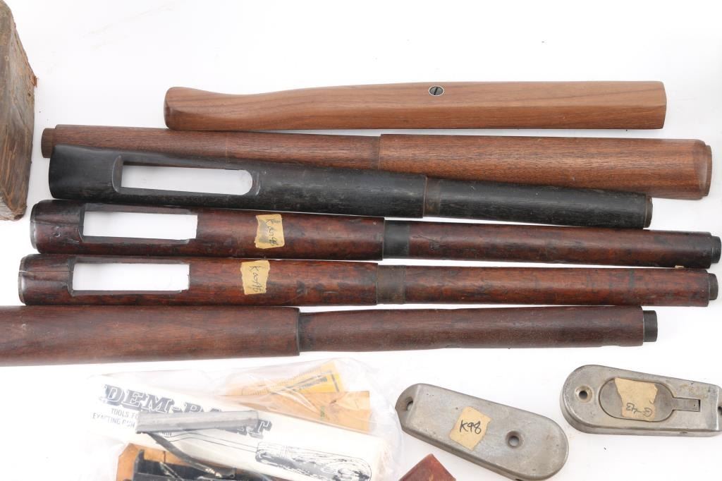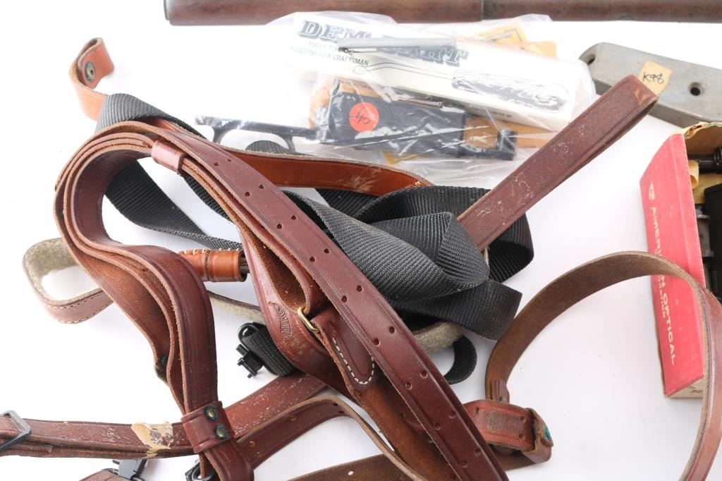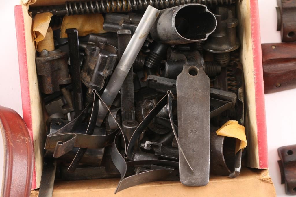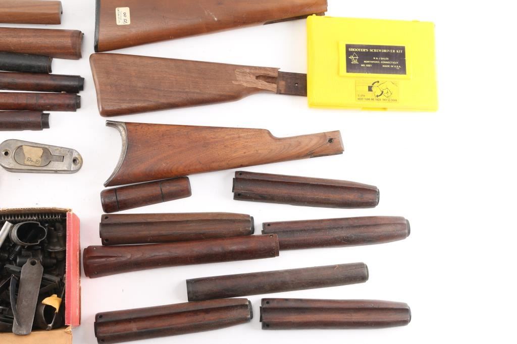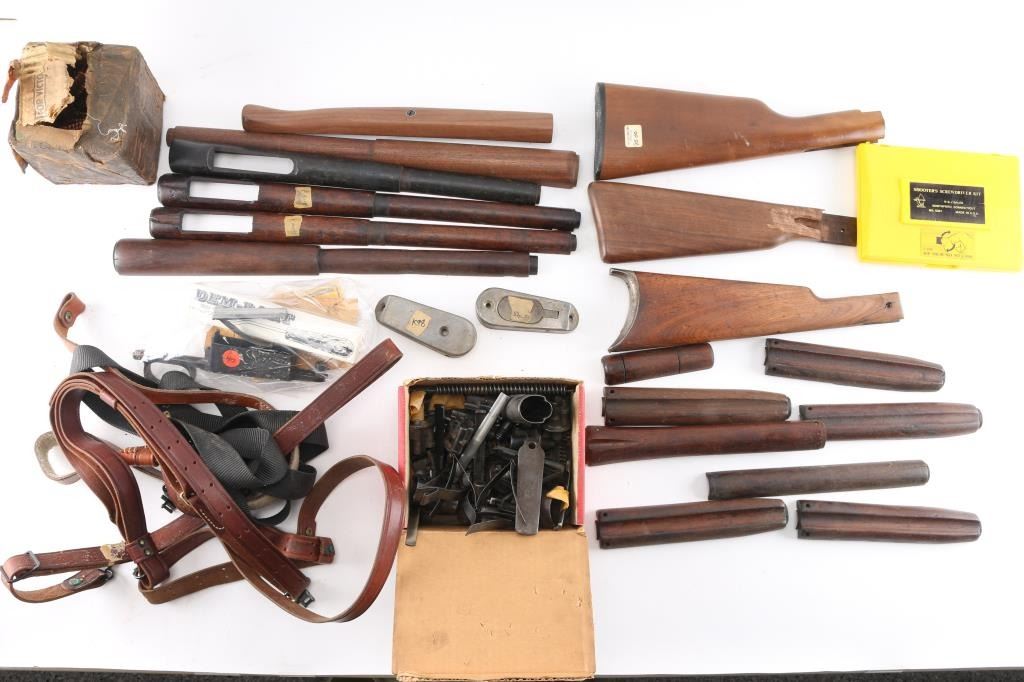 Includes box lot of K98/G43 bolt sleeves, springs and more; M1 Carbine handguards, slings w/sling attachments, stocks for Winchester and other parts.