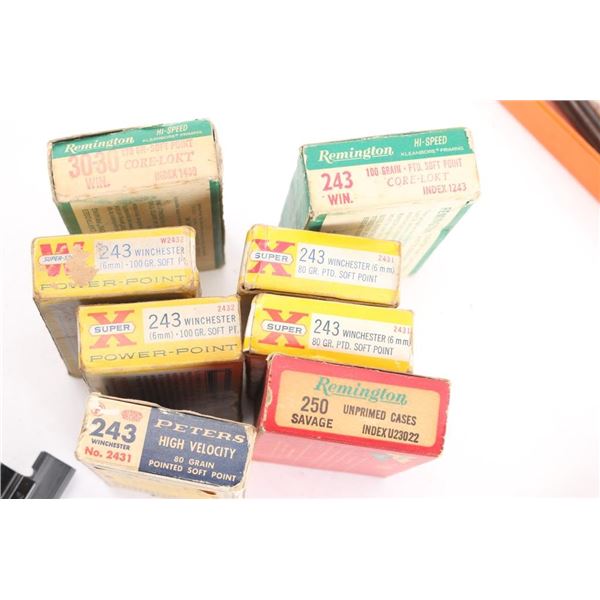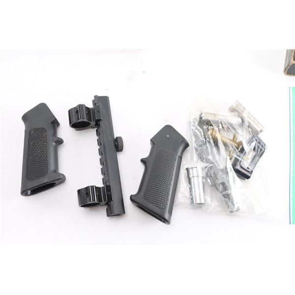 Includes: 2 - AR15/M4 pistol grips, 1 - Scope rail/riser for AR15/M4 handle w/scope rings, 2 - pairs of Glock fingertip extensions for 10mm/45 Colt Super and 9mm/40 S&W magazines, 1 - Original Lee Loader(complete loading system) kit, 3 - pairs of cleaning rods w/unused bore and barrel brushes for .223/5.56, in Hoppes case, 1 - M4/M16 Otis cleaning kit, multiple cleaning pads and more, approx. 100 spent shell casings for .243 Win and approx. 20 for 30-30 & 250 Savage.