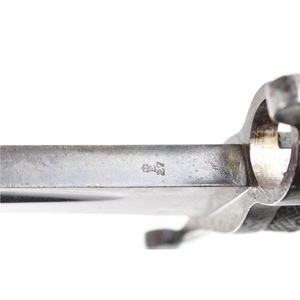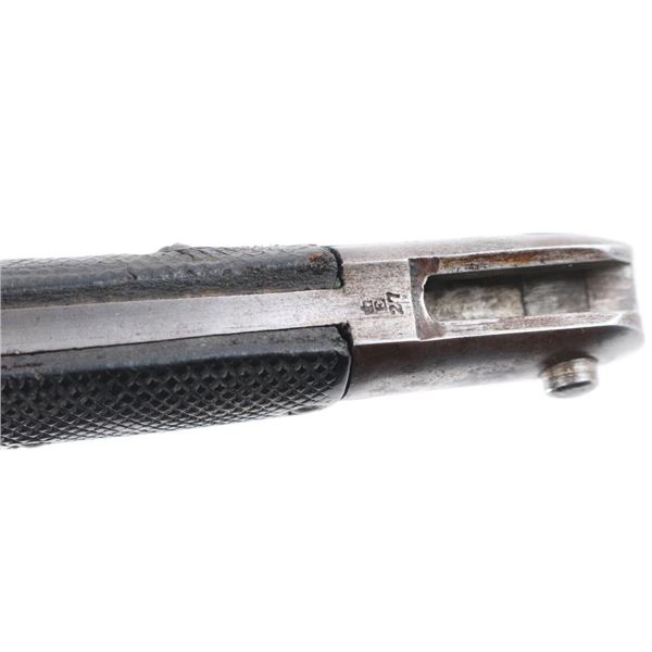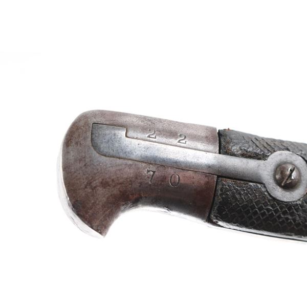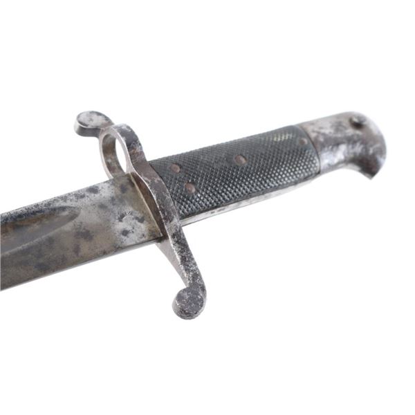British sword/bayonet. 23" Yataghan-style fullered blade, pressed checkered grips held in place with rivets. Ricasso stamped with "WD" under broad arrow (War Dept.) and "E 27" under crown, reverse marked with "VR" under crown (Queen Victoria), flat of blade "E 27" under crown and pommel unit stamped "22" over "70".Blade has turned a gray patina, good with no nicks, pommel and guard have dark patina/pitting. No scabbard.
