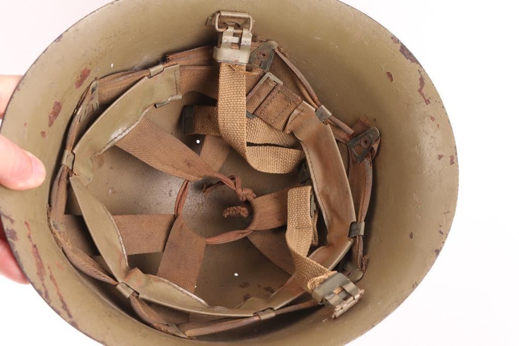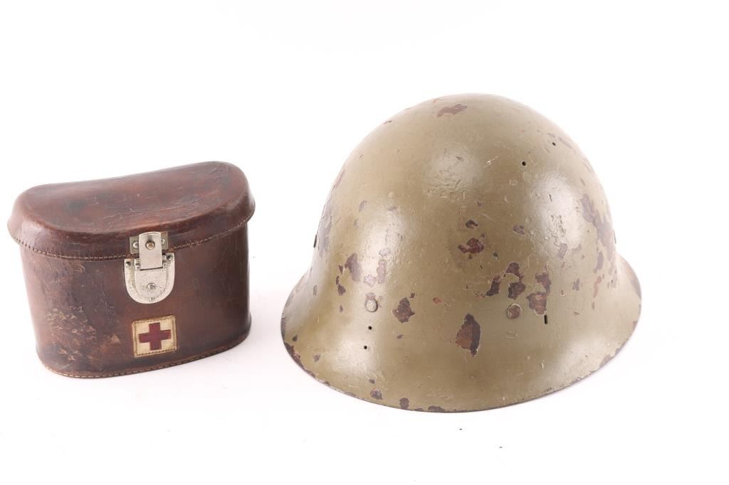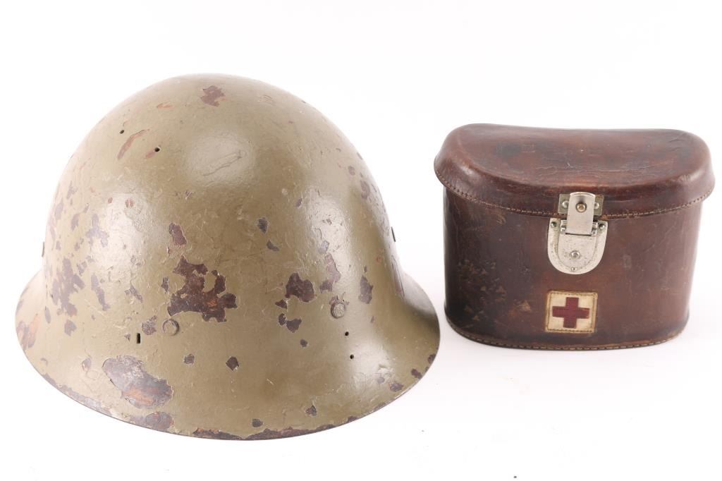 1) Chinese WW2 era brown leather Red Cross binoculars case with metal snap closure. Two piece leather Red Cross symbol machine stitched on front, Red Cross in white square. Four Chinese characters stamped on the lid. Rare. 2) Japanese WW2 Type 90 combat helmet. This is an original Japanese helmet that was refurbished for use in the post war years. Not sure where exactly but likely in Korea, Indonesia, Taiwan or similar. IJA star removed, USGI M1 liner and chinstrap installed. Post war green paint has many chips, liner intact.