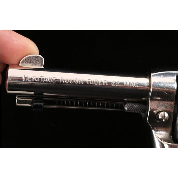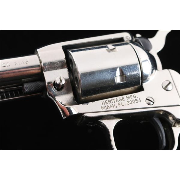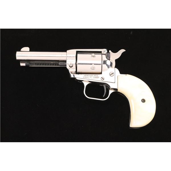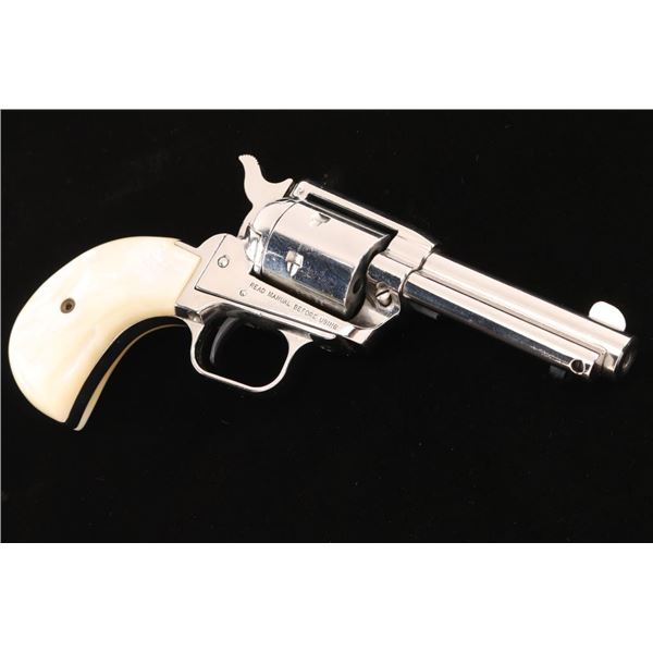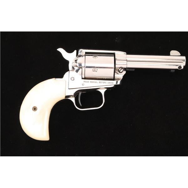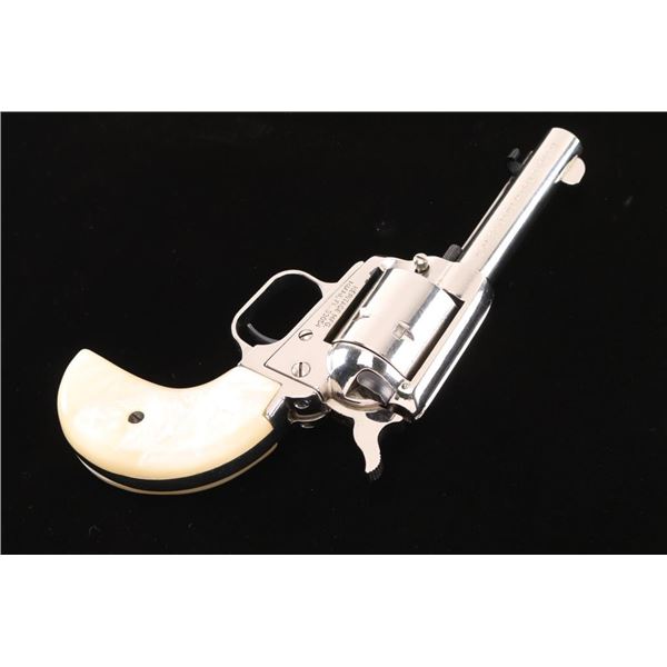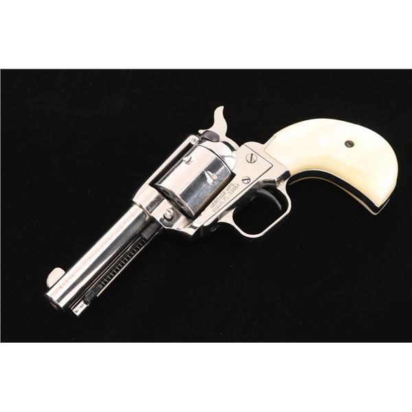 Made in the style of the Colt model 1877. 6-shot, single-action revolver. Nickel finish, blued hammer, cylinder pin, safety and extractor rod. White plastic faux mother of pearl Birds Head grips. 3 3/4" barrel with fixed sights. Bore appears excellent/bright. Action is tight, and cylinder indexes properly. smooth .22 Mag. cylinder on revolver. Nickel finish is about 97% with minor scratches. Grips are excellent. Comes in original factory box with matching label and paperwork.NRA Condition-Excellent. Modern Firearm.