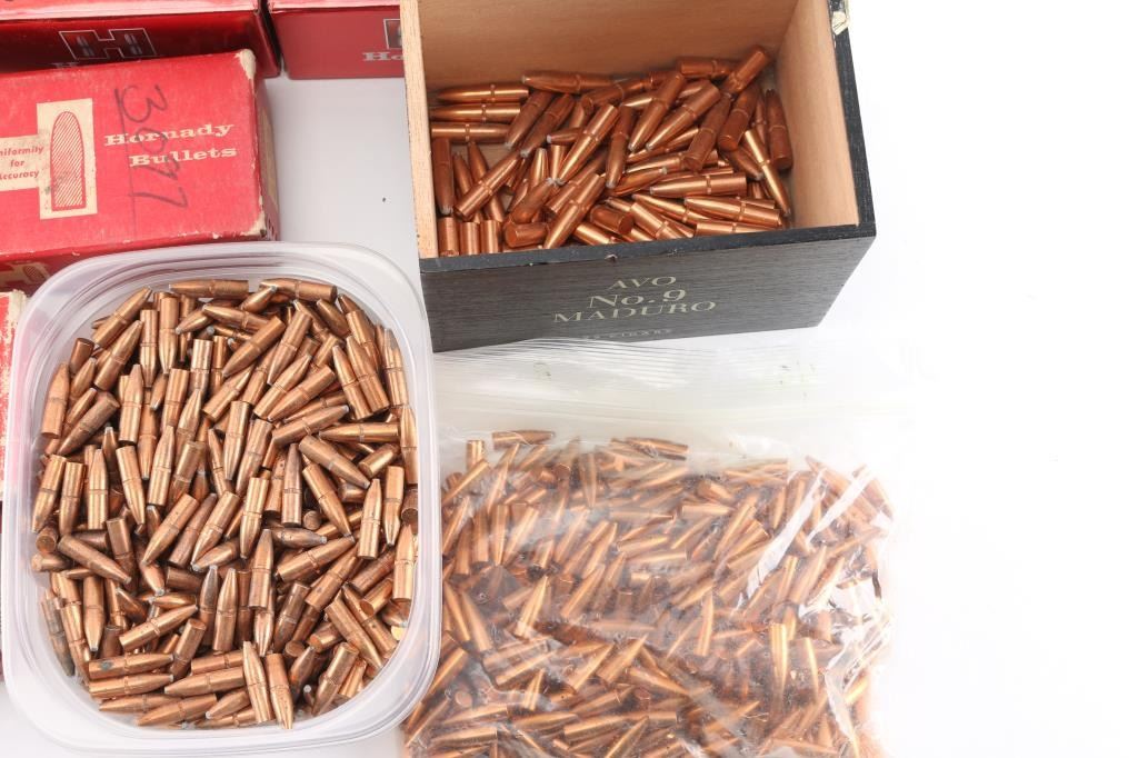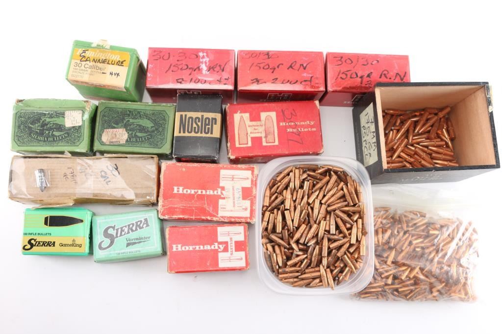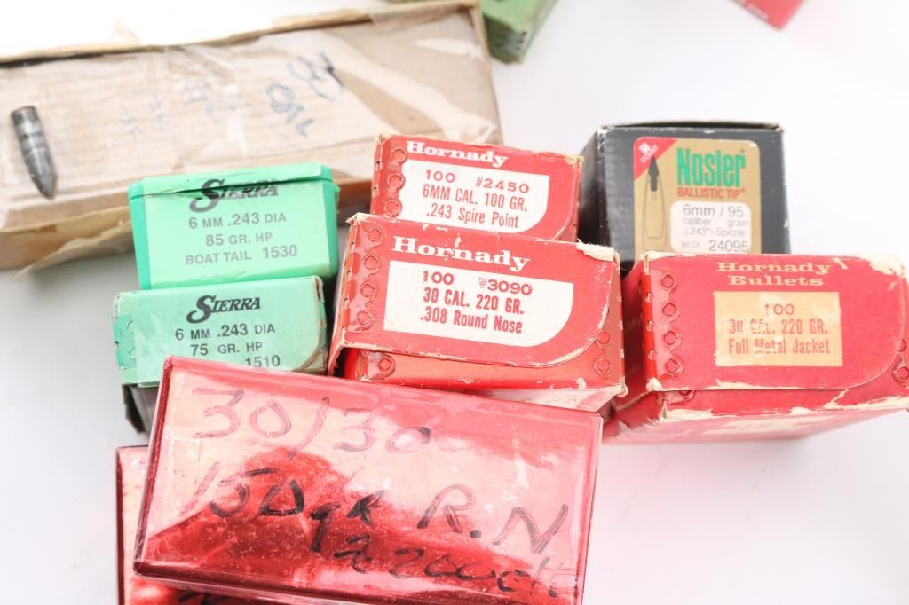 Approx. 2500 bullets total. Includes a mix of factory new and cast .243 cal, 270 cal, & 30 cal jacketed bullets from Sierra, Nosler and Hornady. Various grains and projectiles. Not loaded ammo.