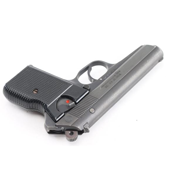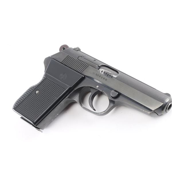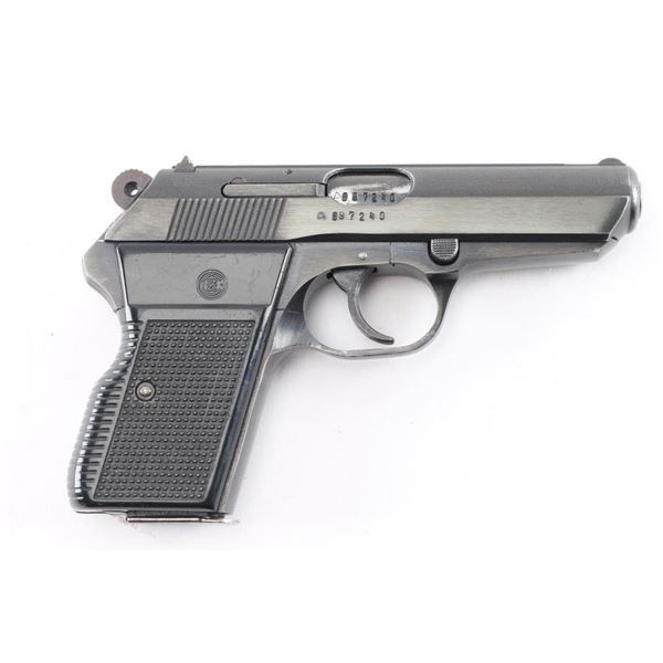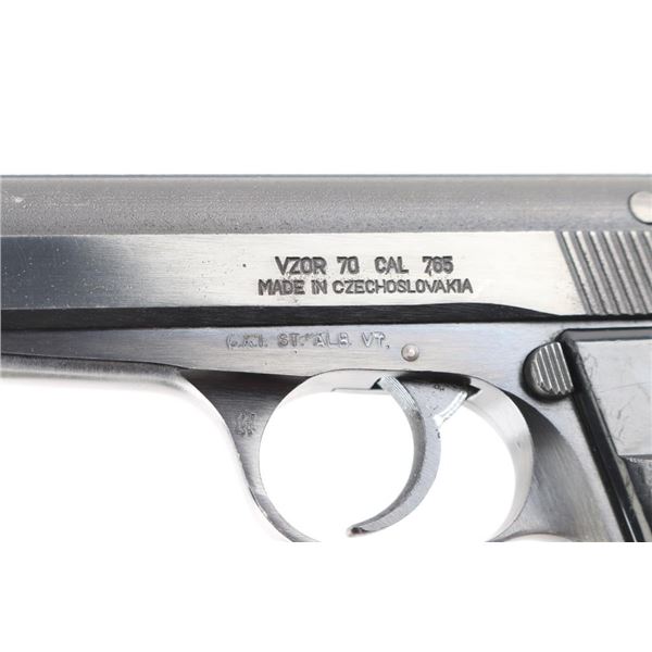 The CZ 70 also called the VZ 70, short for VZOR 70 was developed especially for police in former Czechoslovakia in Strakonice by Kratochvil brothers. Later this model was also produced in Uhersky Brod. In 1970, the CZ 70 replaced the CZ 50 and became the standard sidearm of Czechoslovak armed forces and police until 1983. Design of CZ 70 was based on the Walther PP pistol using a fixed barrel and 8-round magazine capacity. Chambered in 7.65mm (.32 Auto) caliber, single or double action, manual thumb safety on the left side of the frame, exposed hammer. new grip pattern utilizing a grid of dimples instead of grooves as well as flat-faced, serrated trigger, fixed sights, push button magazine release. Imported by C.A.I., marked on the left frame. Bore is excellent, bright, action is smooth, grips are very good with a few minor scratches and the finish is about 94% with minor edge wear/scratches and a couple of minor rubs on the fore strap. Matching serial numbers. Comes with one 8-rd magazine.NRA Condition-Very Good. Modern Firearm.