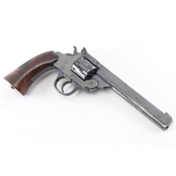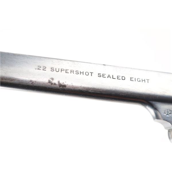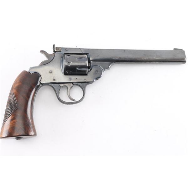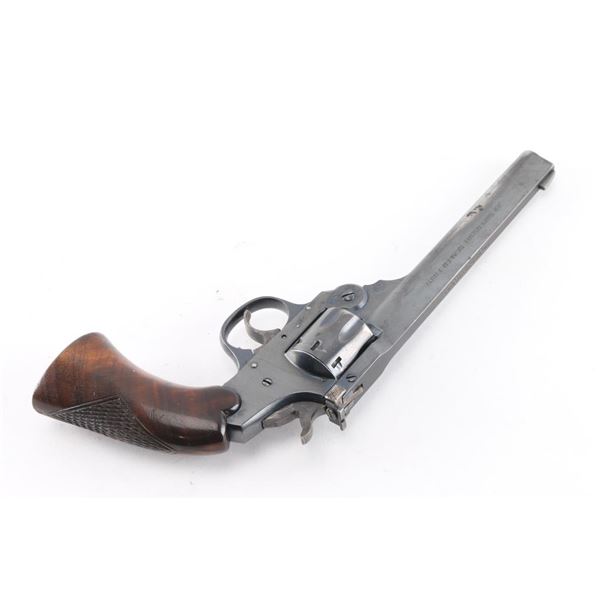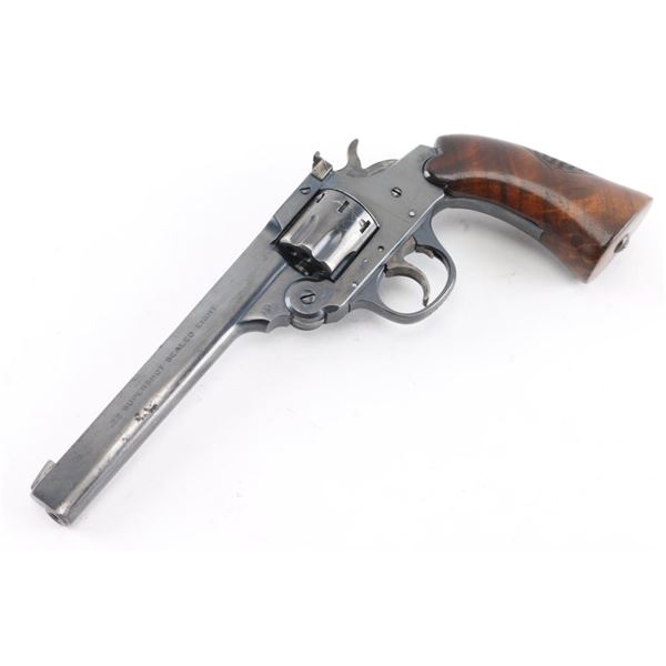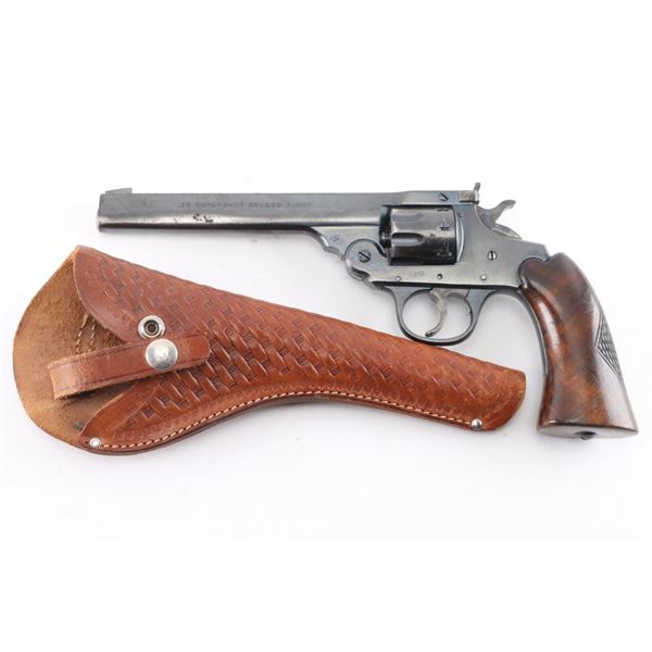 #l36950. Vintage break top double action 22LR revolver. (1932-58) Features 6" ribbed barrel, blued finish, one piece wood grip with checkered panel at rear, blade front & adjustable square notch rear sight, serrated trigger, 8 shot fluted cylinder with counterbored chambers, wide serrated trigger. Bore is excellent. Retains about 80% finish with losses from holster wear, mostly on the barrel, scratches on cylinder. Wood grip is in very good condition. Action operates smoothly with good lock up. Double action only. Comes with German made Rosco brown leather basket weave snap holster.Condition is NRA Near Very Good. C&R Firearm.