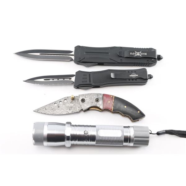 M48 OPS spear point automatic OTF knife with sheath, Gunner Gear automatic OTF knife with sheath, damascus blade folding knife with leather sheath and Tiger USA stun gun flashlight.