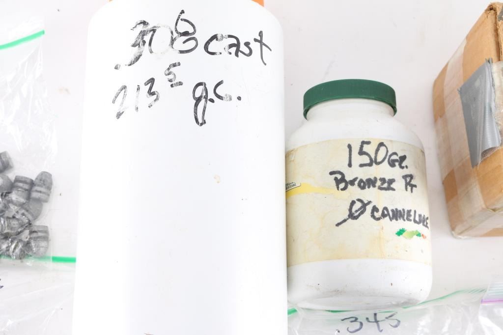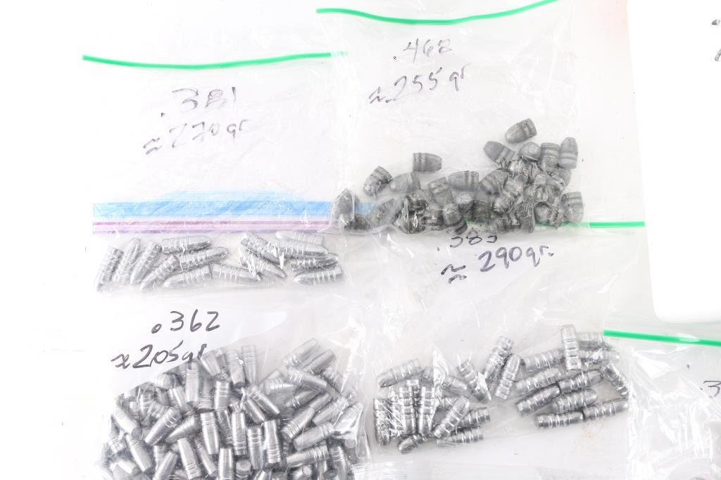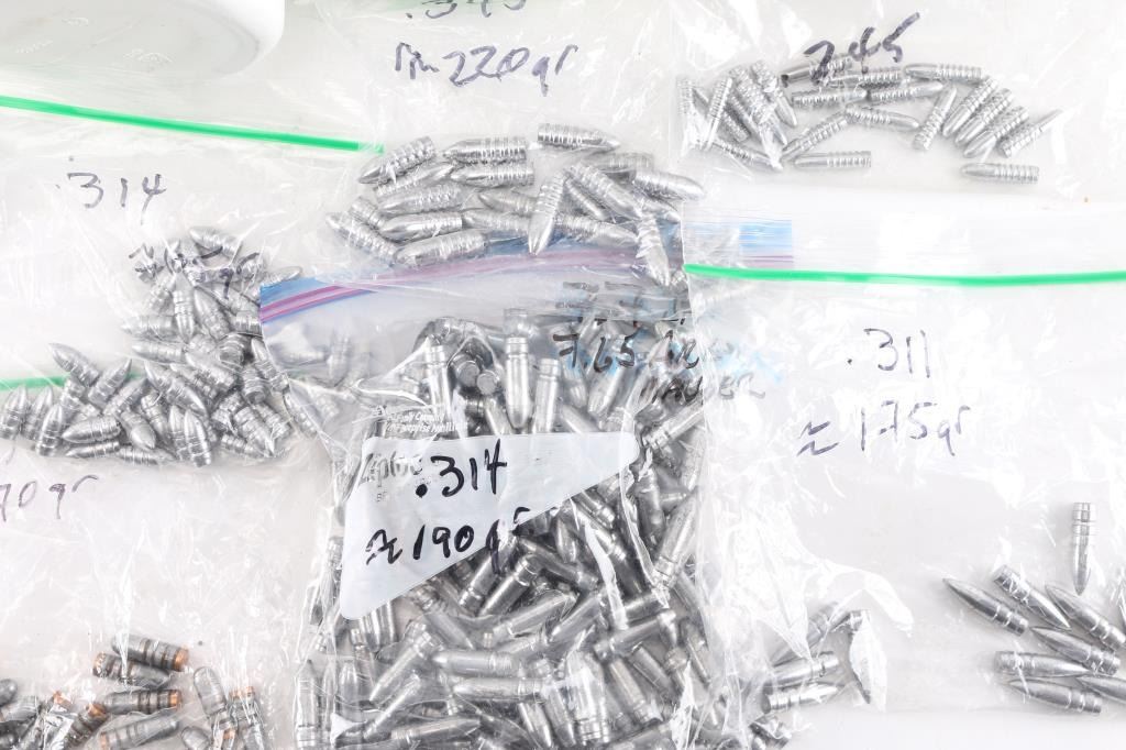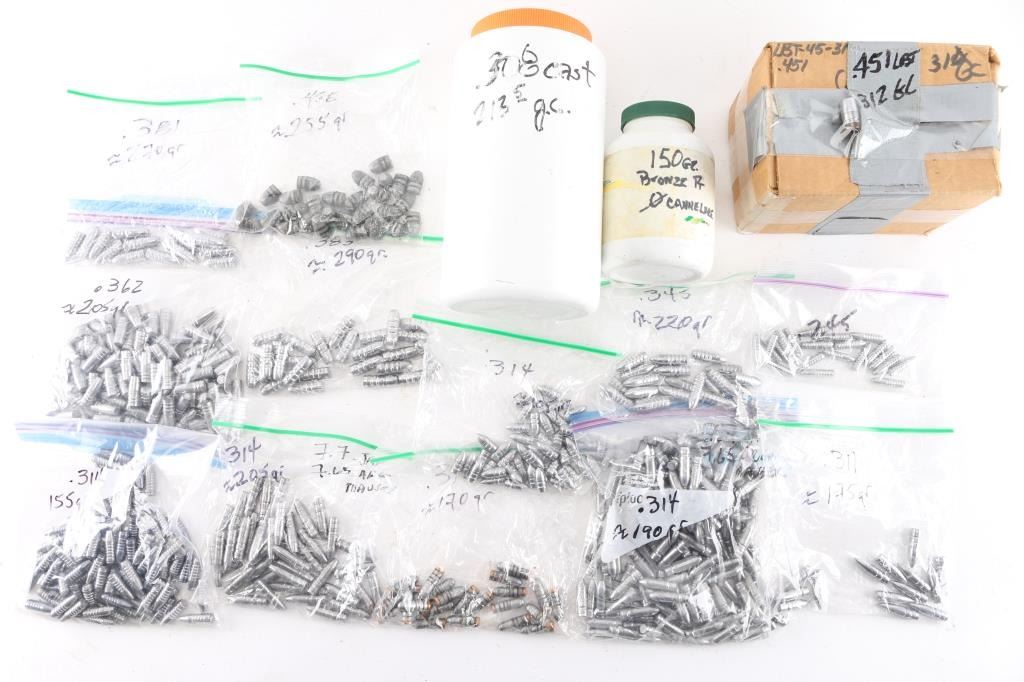 Approx. 1500 total. Includes .245 lead, .308 214 Gr. lead/copper, .311 Cal 175 Gr. Lead, .312 170 Gr. lead/copper, .314 various Grains, .345 220 Gr. lead, .362 205 Gr. lead, .381 270 Gr., .383 290 Gr., .451 310 Gr. and .468 255 Gr. Not loaded ammo.