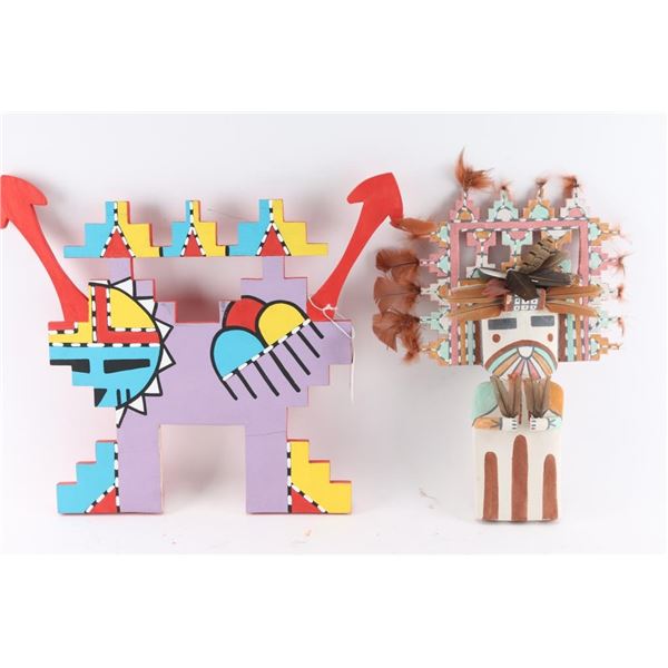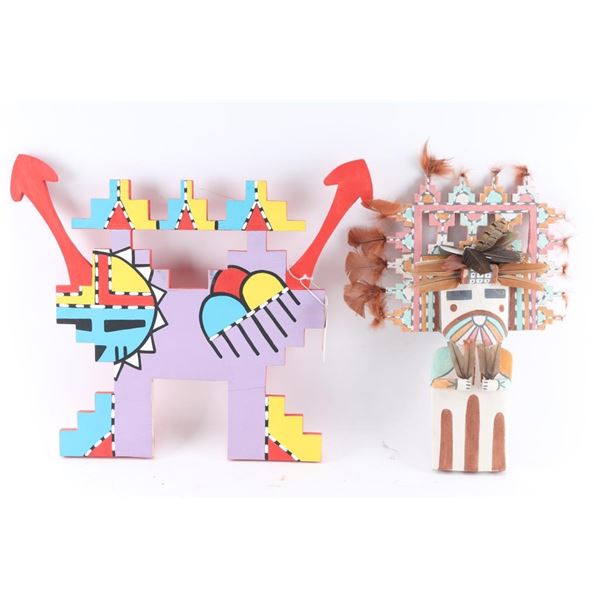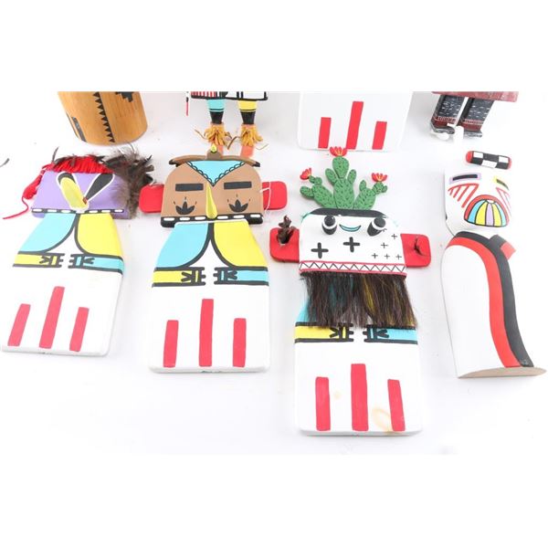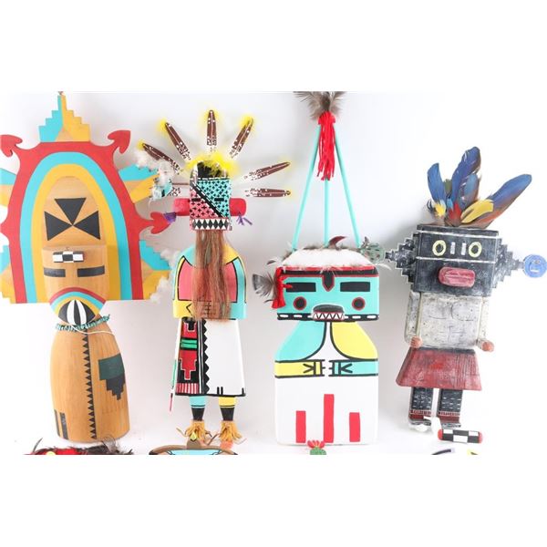 (1) Older looking flat kachina measuring 16", missing some feathers on headdress; (1) Flat kachina, makers marked and dated 09, measures 15"; (1) Flat kachina with turquoise stone necklace, measures 26"; (1) Headdress measuring 16"x18 1/2"; (1) Flat back kachina measuring 15"; (1) Flat kachina, makers marked and dated 08, measures 20 1/2", has stain at bottom and missing feather and other details; (1) Kachina-like carving measuring 20" including feathers by 20 1/2"; (1) Flat kachina with makers mark dated 09, measures 25"; (1) Hopi Whipper Milky Way kachina, by Joe Alker III, Dine artist, dated June 2011, measures 25"; (1) Flat kachina, makers marked, dated 08, measures 15", has a stain and missing some embellishments.