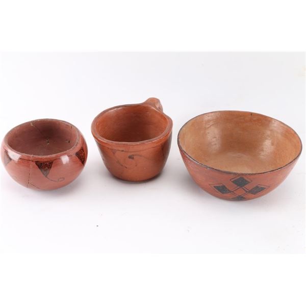 Redware pots with black polychrome geometric designs. Largest is 6 x 2" in good condition. Signed Quitchon on base. Second pot is 3 1/2 x 2 1/2" and has been repaired. Third piece is an older mug, unsigned, 4 x 3". From the Steve Goldstein Collection, Scottsdale, AZ.