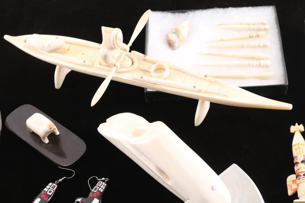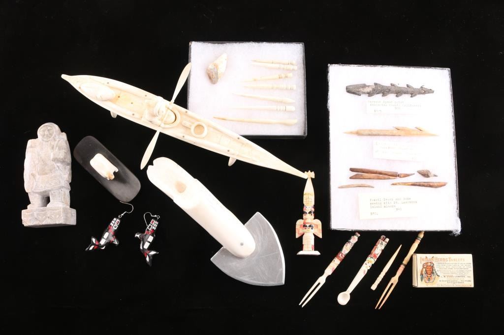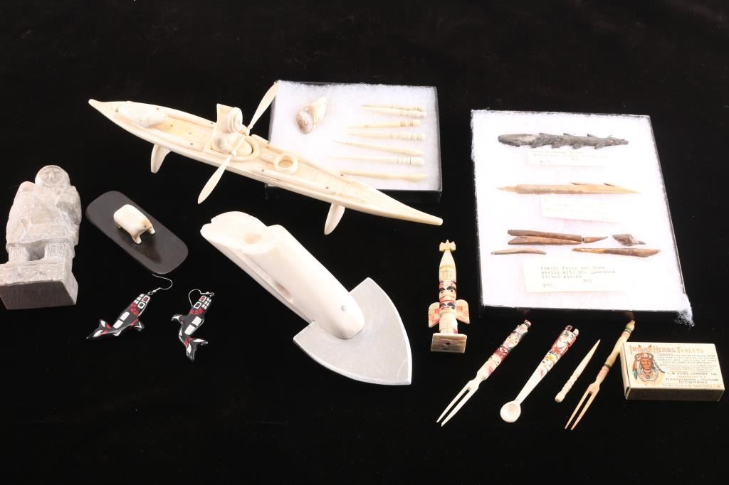 (1) Boat with Eskimo hunter on stand; some cracking in top of boat, measuring 13 1/2" x 4"(1) Small polar bear on black stand, measuring 4" x 1 1/4".(1) Harpoon head with steel blade, measures 9" x 3 1/2",(1) Carved stone Eskimo with beaver catch, measures 5 1/2" tall.(2) Shadow boxes, one containing fossil ivory harpoons and one of carved ivory points, measure 9" x 6 1/2" and 6 1/4" x 5 1/2", respectively.And, miscellaneous small ivory and other.**FOR SALE ONLY IN AZ BY LAW AND COMMERCE; NOT SHIPPABLE**