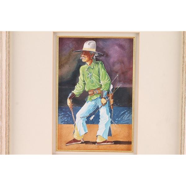 By Edward White Thorne. Depicts Indian man with single action and bow. 5 x 8" Hand signed, double matted and framed. From the Estate of Steve Goldstein, Scottsdale, AZ.