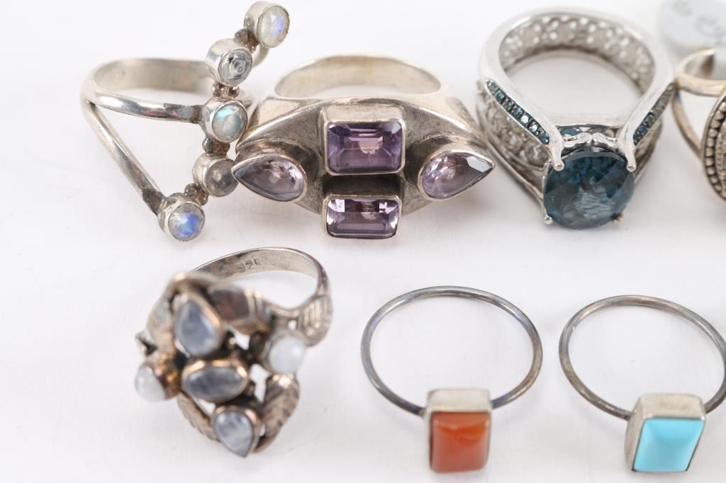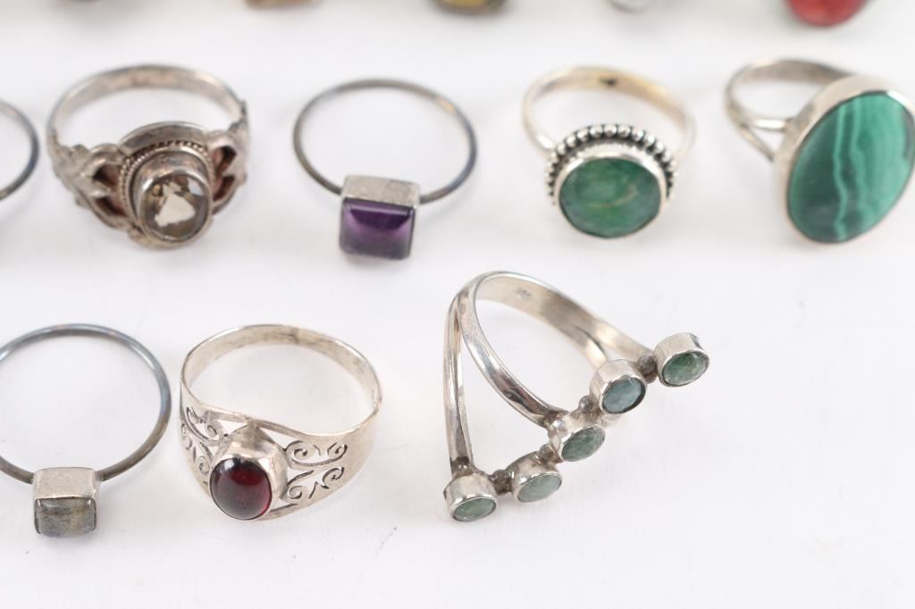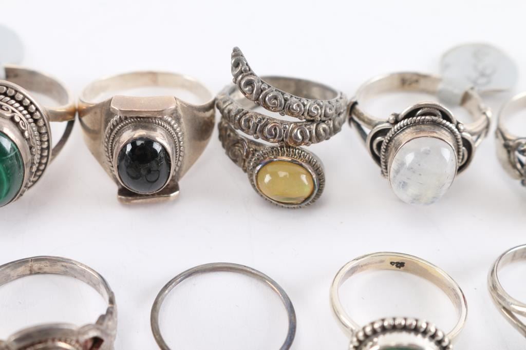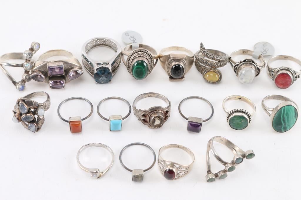 Approximately 18, mostly sterling silver, most have gemstone in setting. Various sizes.