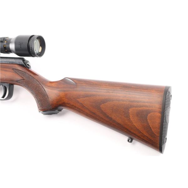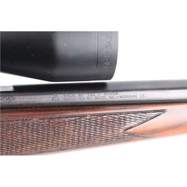 This is the Toz-78-12 and is a highly regarded rifle for its accuracy. Manufactured by the Tula Arms Plant (Russian abbreviation TOZ stands for Tulsky Oruzheyny Zavod), which were used to train generations of Russian military, paramilitary and police cadets. Russian bolt action rifle, chambered for 22 LR cartridges. Features an approx 21" barrel with blade front sight, rewar sight removed and mounted with a BSA Catseye 3-10X44 scope with a European style duplex with three heavy stadia wires and a normal wire on top, receiver has dove tail rail for optics, lens cover, clear optics detachable magazine holding 7 rounds, sights, sling studs, wood stock with impressed checkering panels at wrist and forearm, schnabel fore tip .Right magazine well mounted manual safety, polished bolt with swept back handle. Bore is excellent/bright. Rifle overall is in like new condition with a couple of very minor chips on the magazine well. Imported by BACO Inc. Margan, UT, marked on right barrel. The Toz 17 design was upgraded to the 17-01 standard in 1978NRA Condition-Excellent. Modern Firearm.