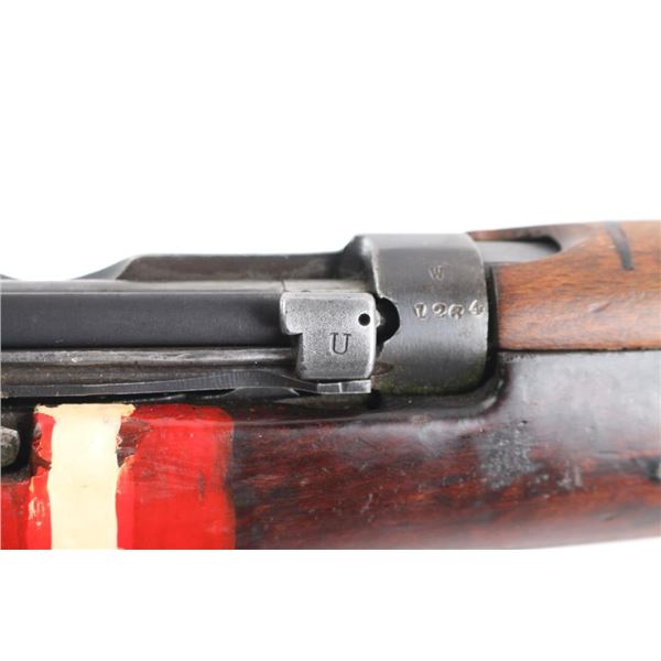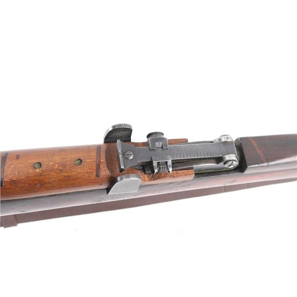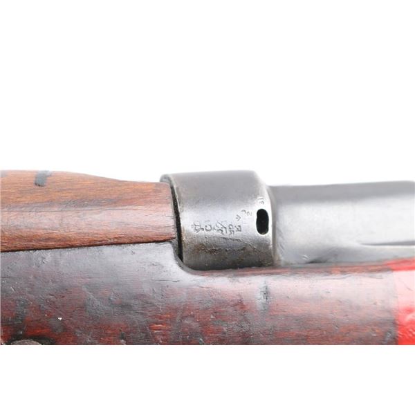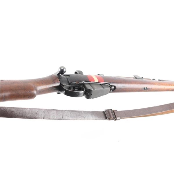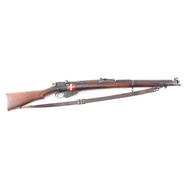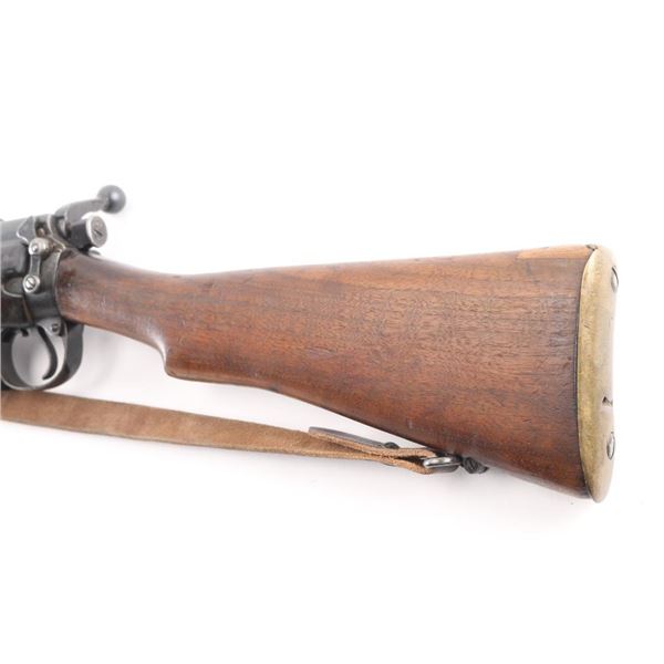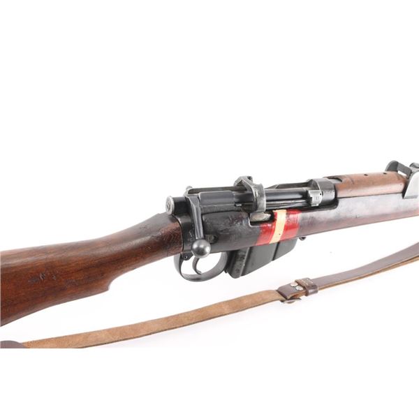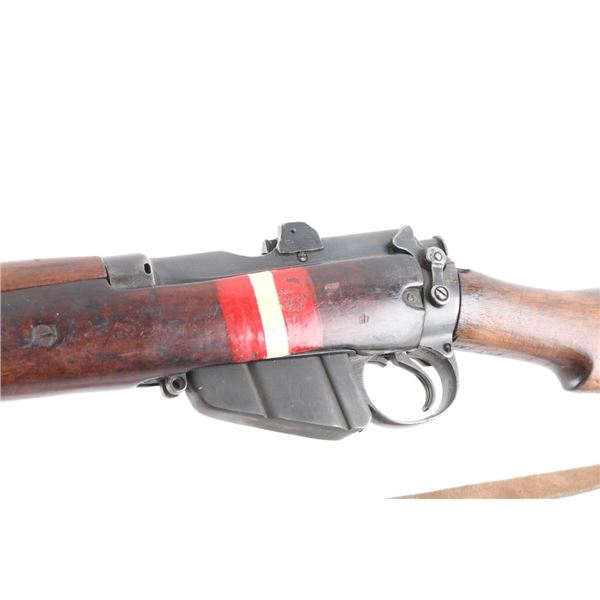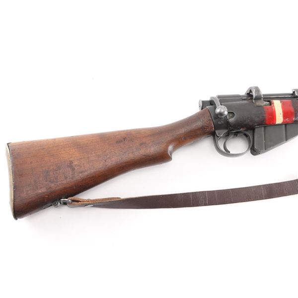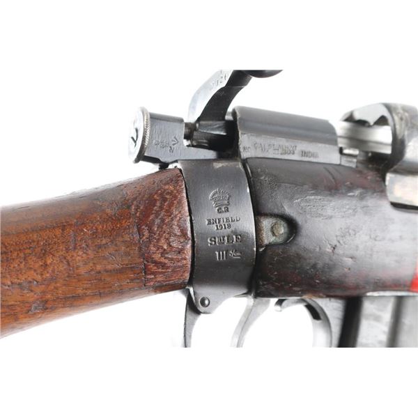 WW1 British military bolt action rifle dated 1918. Features 25" barrel, bayonet lug, protected post front sight, adjustable rear tangent sight with protective ears, 10 round detachable magazine, stripper clip guide bridge, manual safety, sling swivels, two piece wood stock with straight grip, brass buttplate with trap door storage compartment. HAs the British BRB red/white stripes painted on the stock sides above the magazine, indicates that the rifle is a drill purpose (DP) rifle, meaning it has been modified to be safe to handle for training purposes. Do not attempt to shoot it. Bore is very good condition, with strong rifling. Retains about 70% finish with handling/edge wear. Wood is good condition with scratches/dings, with wood plugged repairs, on the lower comb and the upper right butt stock were it meets the socket. Many British proofs and stock cartouches. Imported from India by C/A/I/ marked on the right receiver. Non-regulation military brown leather sling with snap hook attached. NRA Condition-Good/Non-Firing. C&R Firearm.