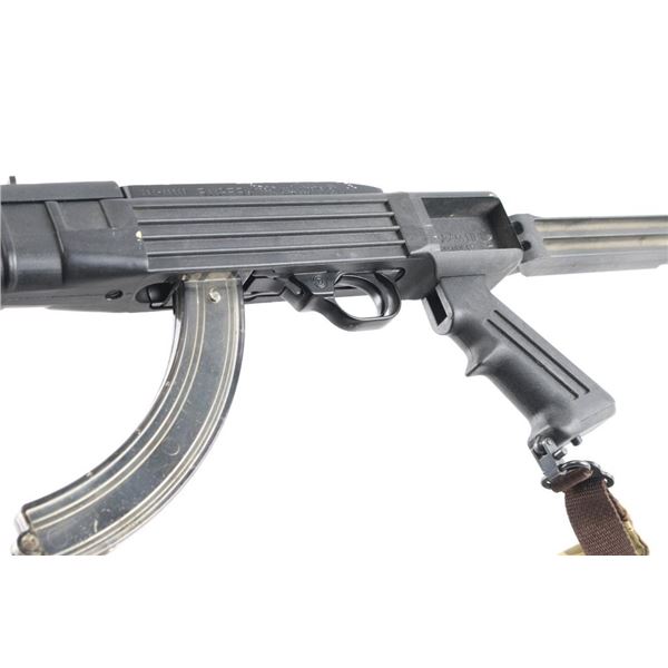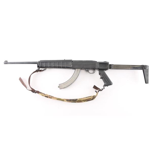 Upgraded 10/22 semi-automatic rifle. 18.5" barrel, with rear flip notch, front blade/bead sights. Black painted receiver drilled/tapped for optics. black polymer Ram-Line right folding pistol grip stock with ventilated handguard. Bore is excellent/bright, action is smooth Folding stock is very good with a few minor scuffs, blued barrel has some minor scuffs/scratches and the top of the receiver has many scuffs with finish loss, needs touch-up . Comes with a padded, camo nylon sling and a clear plastic Ram-Line 50-rd magazine.NRA Condition-Good. Modern Firearm.