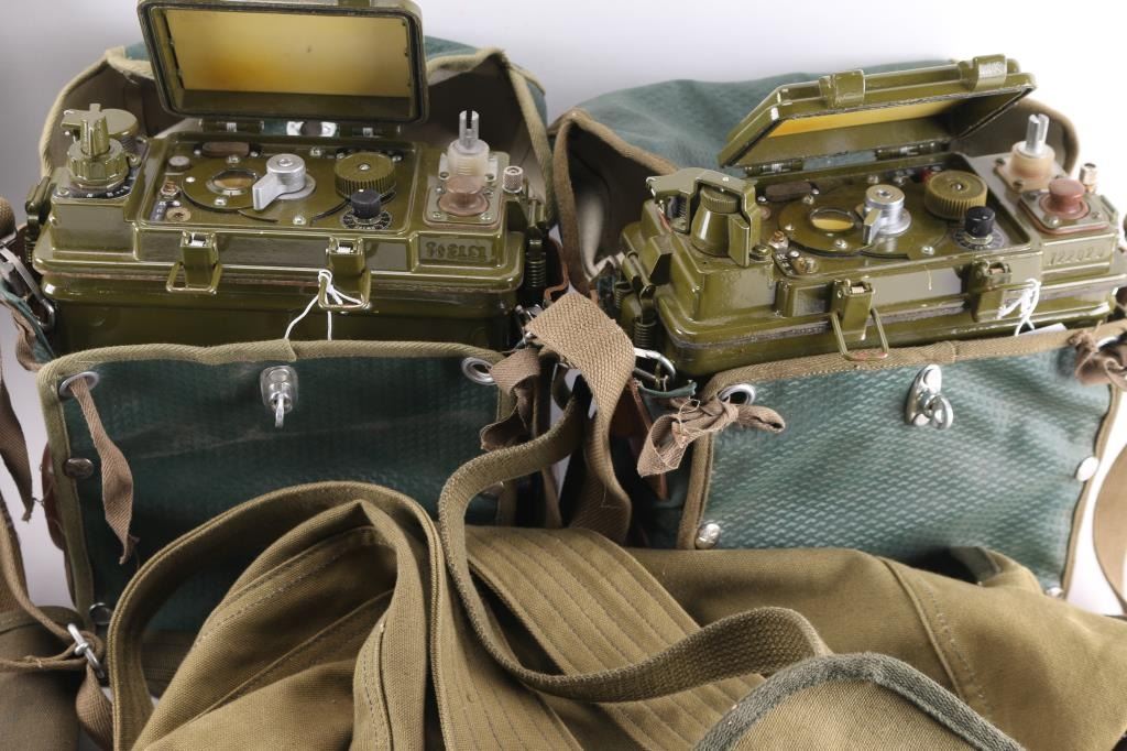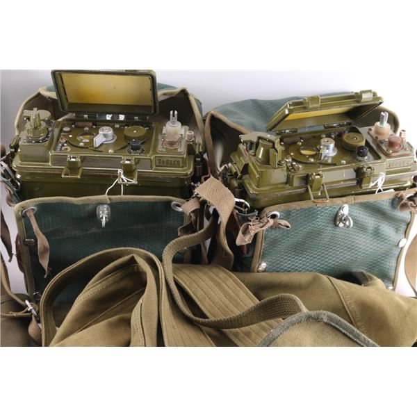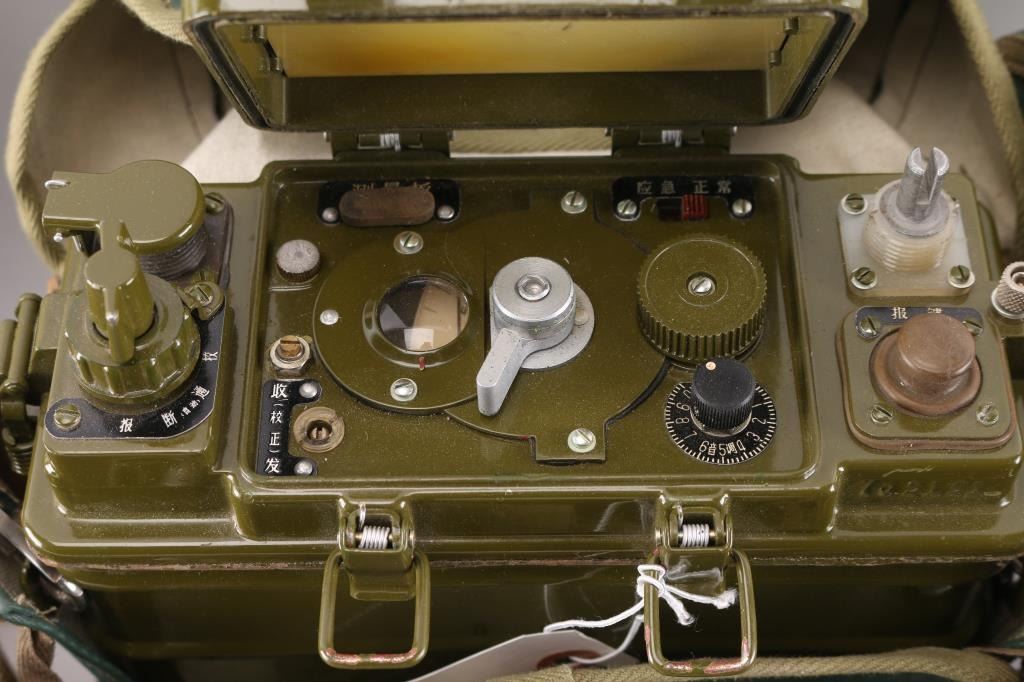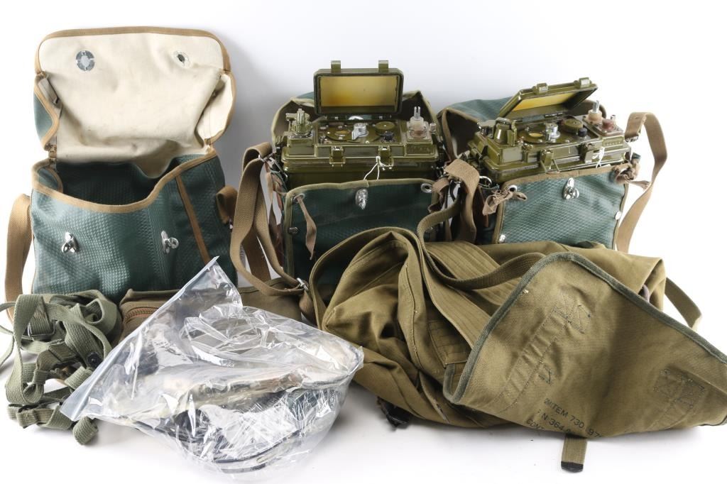 Two vintage Chicom Model 884 Transmitter/Receiver radios, made in China. This type of man-pack radio was heavily supplied to the North Vietnamese Army (NVA) during the Vietnam War. One radio comes with manual in Korean language, headset, mic & antenna, comm wire and more. Both are in military issued radio bags, all in canvas Alice style pack. Radios are in very good condition with no batteries. conflict Vietnam branch North Vietnamese Army item Transmitter/Receiver