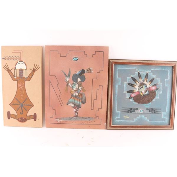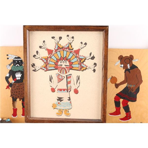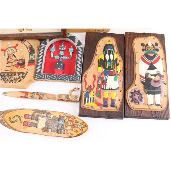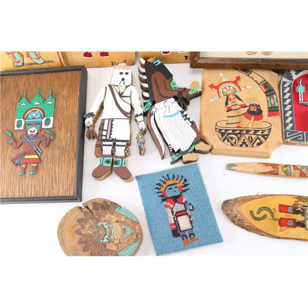 4 Kachina puzzles, Kachina needlepoint, 2 carved Kachina wall hangings, carved wooden knife, 10 wooden Kachina wall hangings.
