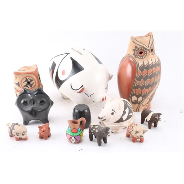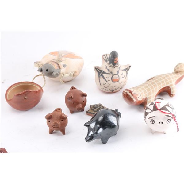 Includes 12 pigs (stone and pottery), 1 alligator, 3 owls, 1 turtle, 1 mouse, 1 bird, and others