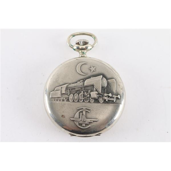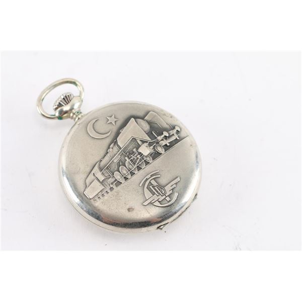 Swiss made TCDD railroad pocket watch. 15 jewel The State Railways of the Republic of Turkey (Turkish: Türkiye Cumhuriyeti Devlet Demiryollari), abbreviated as TCDD,the back of the silver case is embossed with a steam locomotive, the star & crescent and "TCDD" with the T in the shape of a hammer. The face has a red wheel with wings motif. In good working order. Circa 1950s-60s.