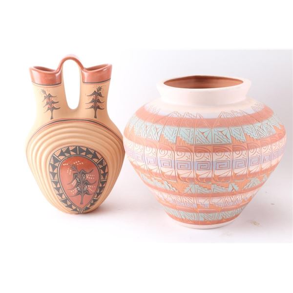 \(1) Large incised carved pot 9x11"; (1) Wedding Vase with Maize motif 11"x7"; (1) Red porcelain vase 8"x13"; (1) Small Vase; (1) Mudhead Vase; (1) Small Pot.