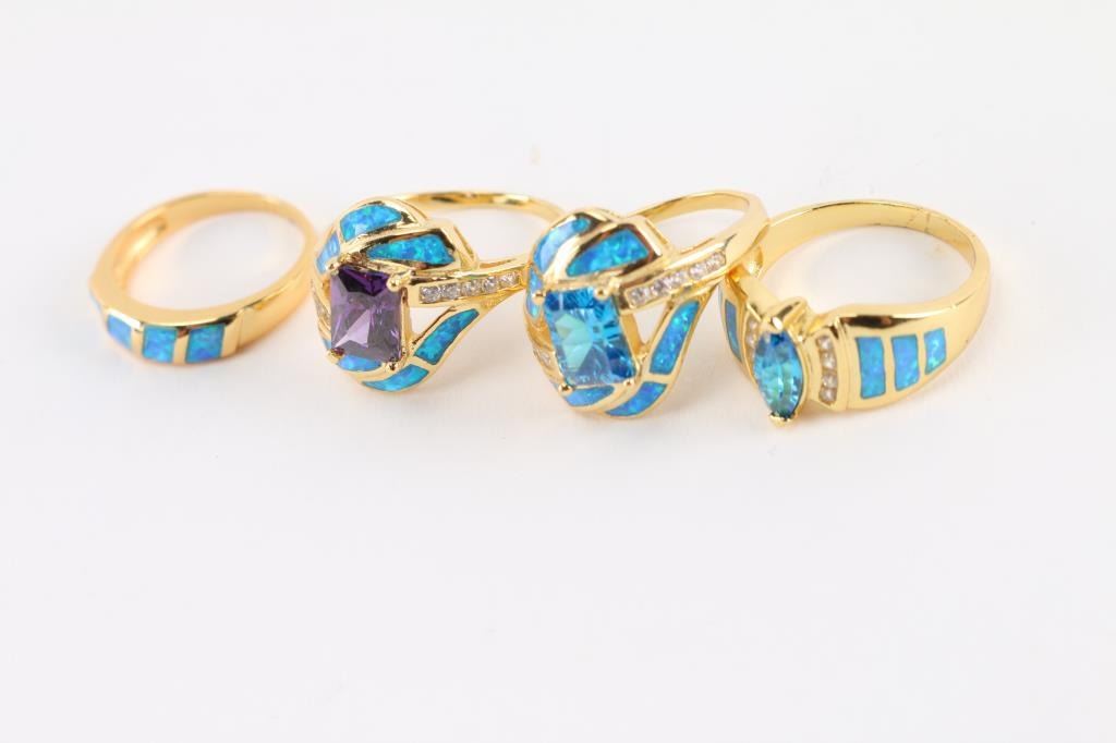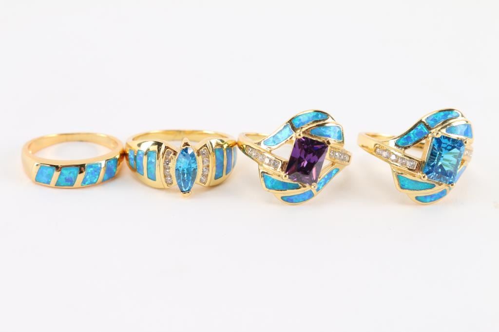 22K gold over sterling silver, with semi-precious stones. Sizes 6, two are 7 3/4, 8 1/2.