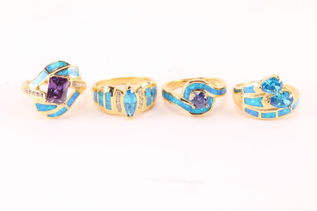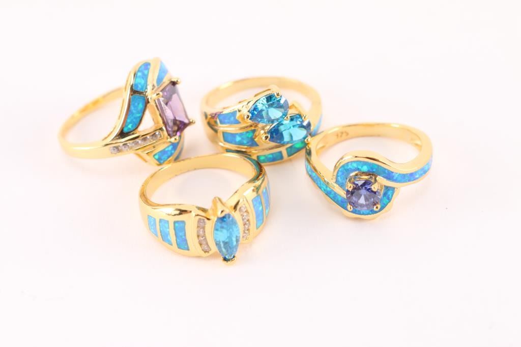 22K gold over sterling silver, with semi-precious stones. Sizes 6 1/4, 6 3/4, 7, and 7 1/2.