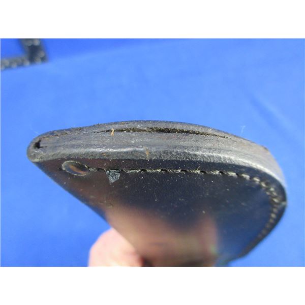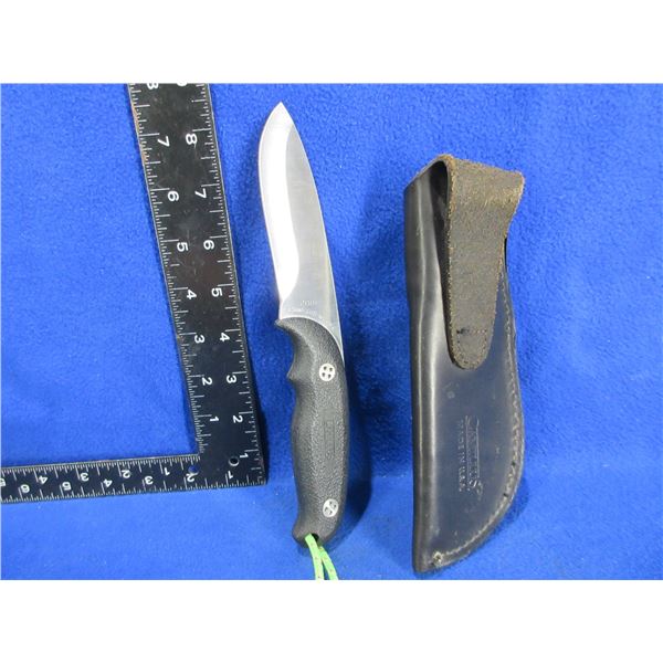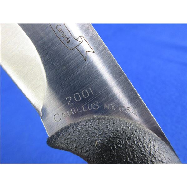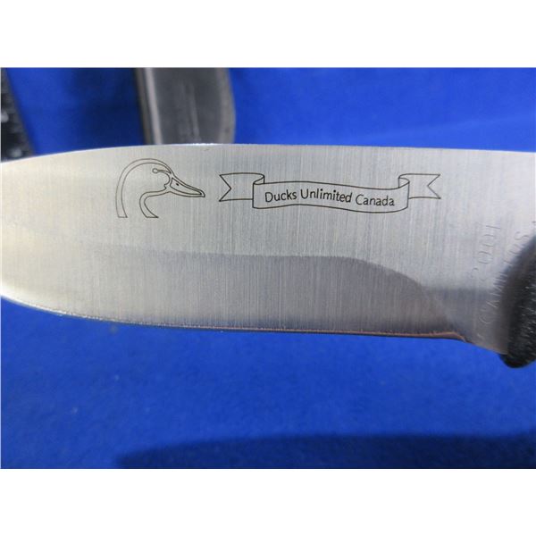 Camillus 2001 Ducks Unlimited Canada Fixed Blade Knife with Leather Sheath - 4" Blade - Sheath is damaged (knife tip is protruding through)