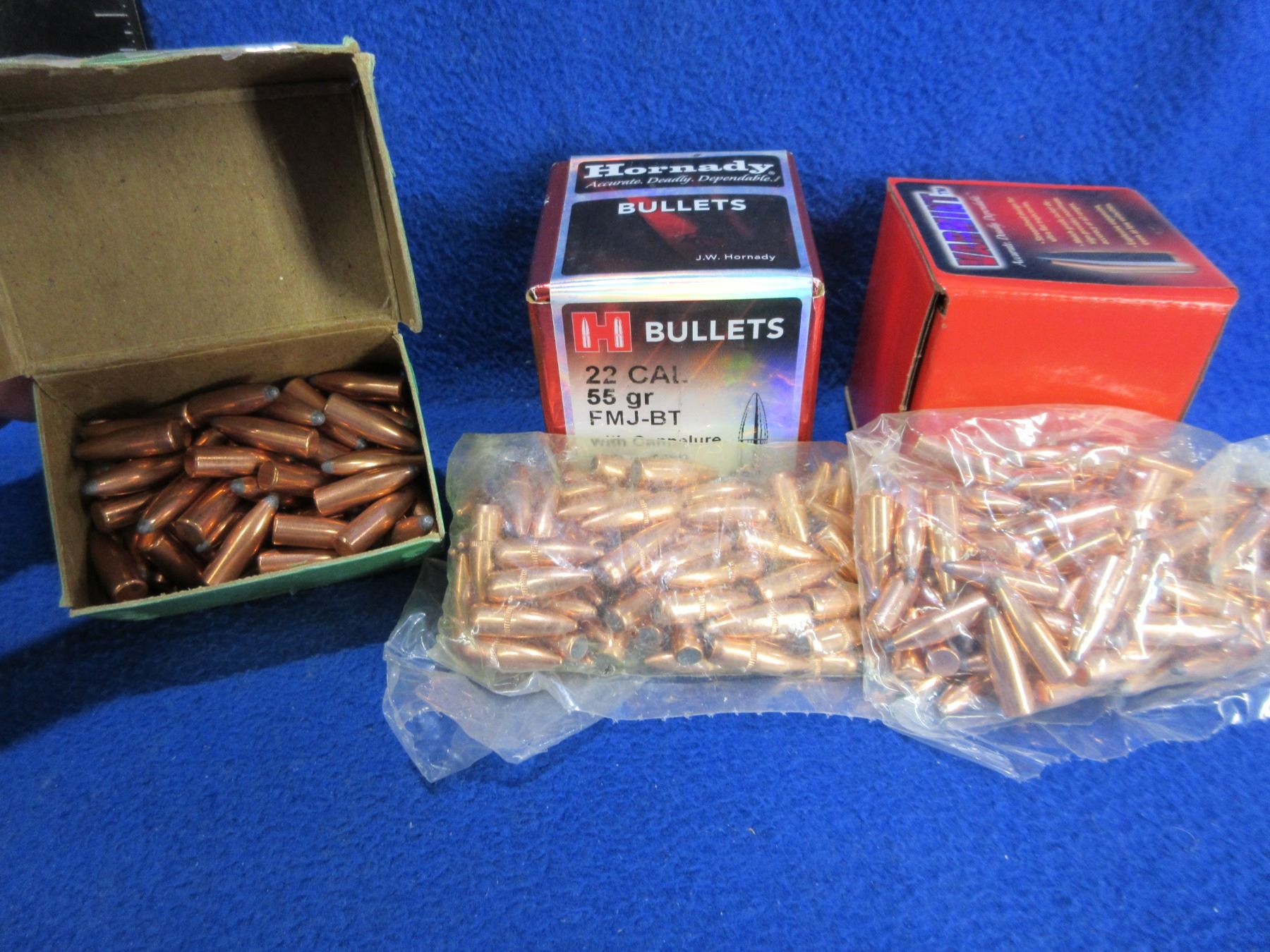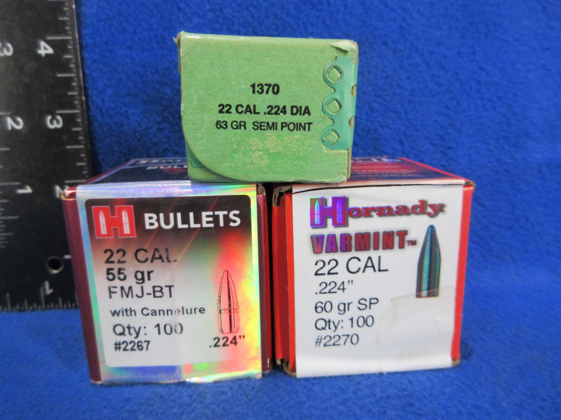 22 Cal. .224" Hornady and Sierra Bullets - Box of 65 (Sierra 63gr SP), Box of 100 (Hornady 55gr FMJ-BT), Box of 100 (Hornady 60gr SP)