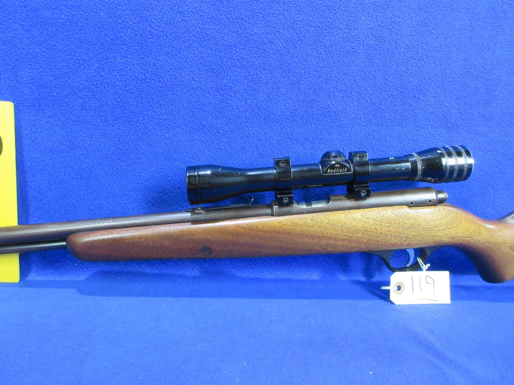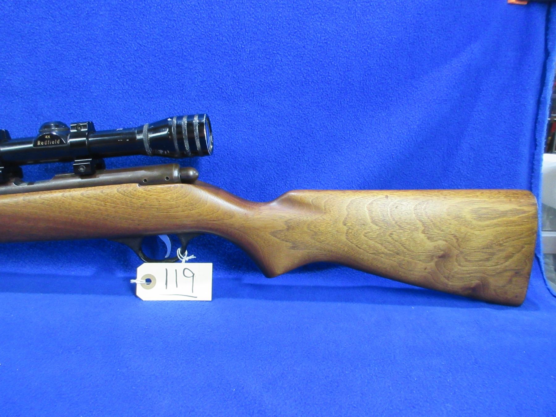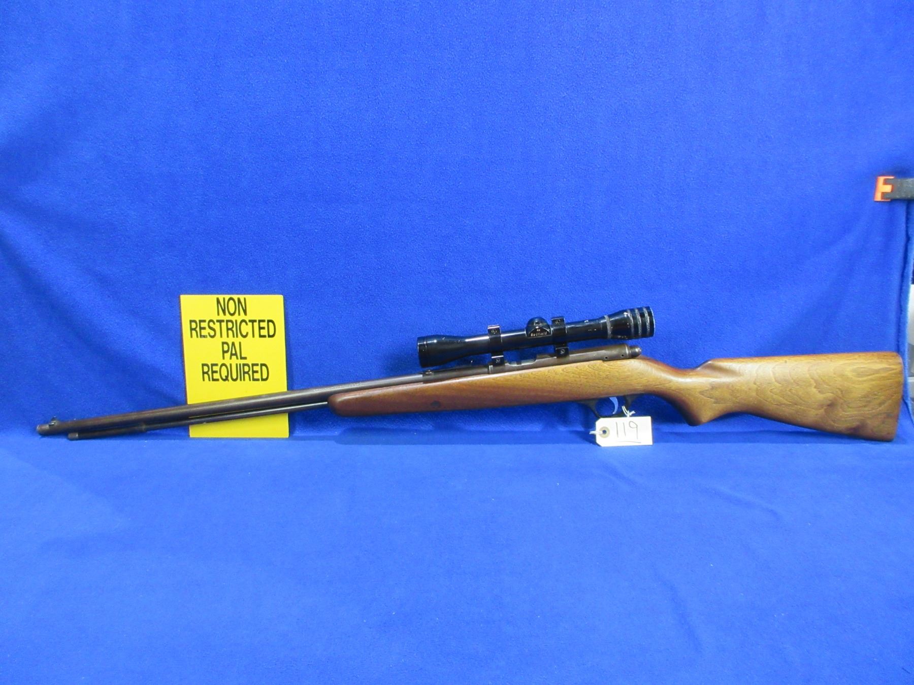 Non-Restricted - Marlin Model 81 in 22 S/L/LR - This is a bolt action rifle with tube magazine. Action appears to be in working order but safety is not working correctly. Barrel is 24", rifling is good to very good, bluing is turning brown, has both sights but rear sight missing ramp, has Redfield 4x scope with lens covers - appears clear - duplex reticle, stock is good with usage marks, metal butt plate poor. Ser #None