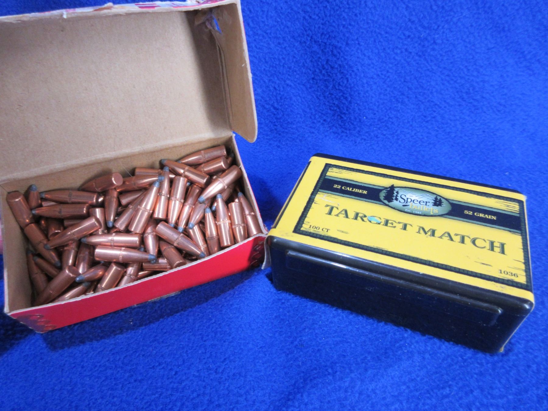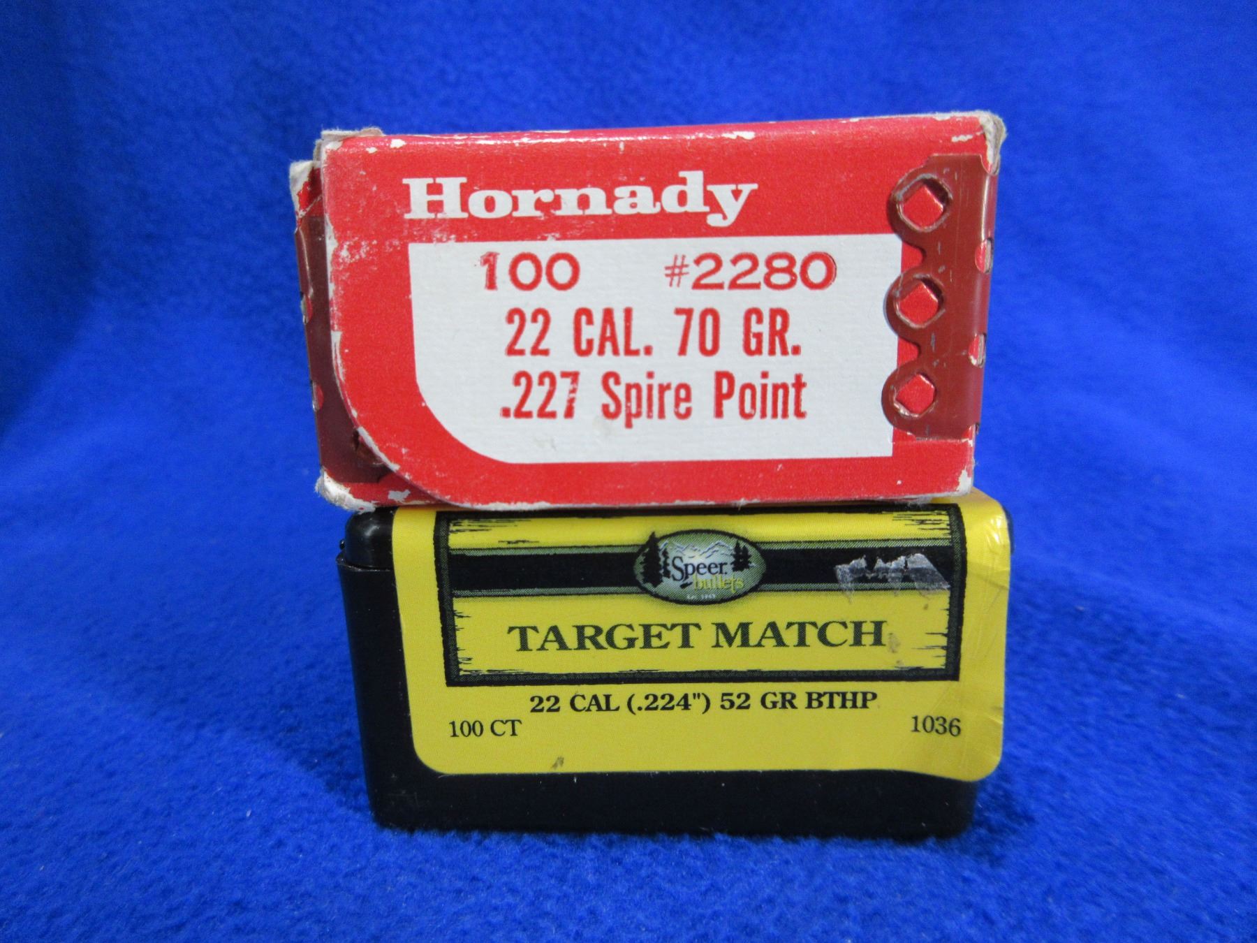 22 Cal. Speer and Hornady Bullets - Sealed Box of 100 (Speer .224" 52gr BTHP), Box of 100 (Hornady .227" 70gr Spire Point)